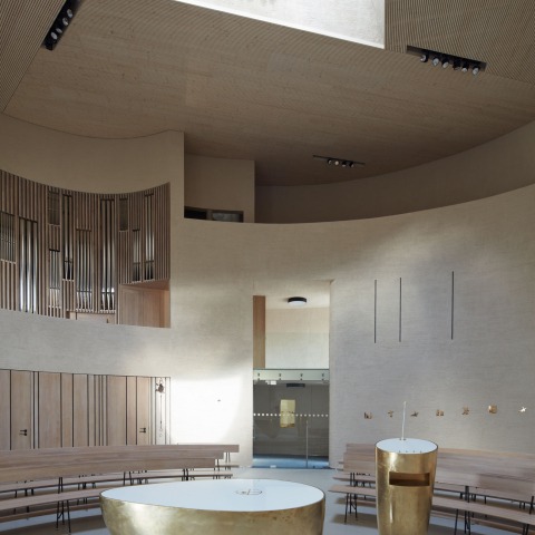 El interior es poeticaly minimalista con decoración modesta. Las iglesias históricas están llenas de información visual - toda la historia está escrita en pinturas, esculturas, decoraciones. Por ejemplo, el interior en la iglesia barroca era completamente descriptivo para dar a gente analfabeta una idea sobre la vida de Jesús. Hoy en día estamos abrumados con información y tendemos a buscar un lugar tranquilo de meditación y darnos cuenta de nuestro propio ser interior.
