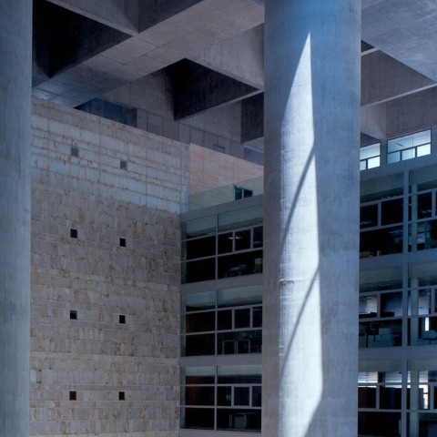 En este podio se resuelven aparcamientos, archivos y Centro de Proceso de Datos. En el cubo, alrededor del patio central, se organizan las oficinas en siete plantas. El cubo se construye con una trama de hormigón armado de 3 x 3 x 3 m que en la cubierta sirve de mecanismo para recoger la luz, tema central de este edificio. Las dos fachadas a sur funcionan a modo de "brise-soleil" e iluminan, matizando esa luz potente, las zonas de oficina abierta. Las dos fachadas a norte, sirviendo a las oficinas individuales, reciben la luz homogénea y continua propia de esa orientación y se cierran al exterior, mediante una plementería de piedra y vidrio.