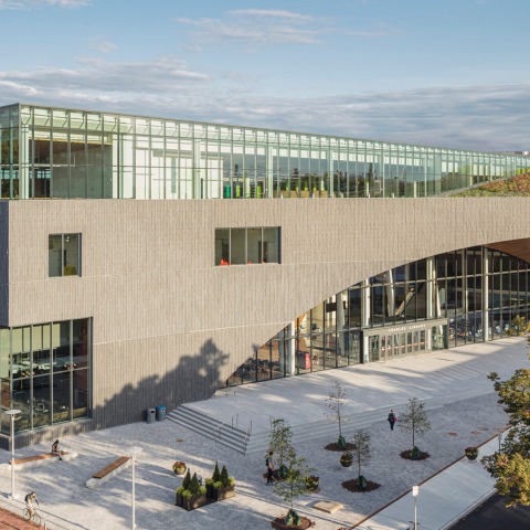 Covering over 70 percent of the building’s roof surface, the 47,300 square-foot green roof is one of the largest in Pennsylvania and also plays a key role in the site’s stormwater management system. The Charles Library site at large is designed to capture and retain a maximum amount of rainwater not only from the Temple campus but also from Philadelphia’s aging infrastructure, which has been historically overburdened during storm events. Designed to meet the progressive Philadelphia Water Department guidelines, the library’s stormwater management system includes the green roof, pervious paved plazas and paths and landscaped planting beds that infiltrate rainwater, and two underground catchment basins that together can store and process nearly half a million gallons of water during storm events. Taken altogether, the project manages all rainwater runoff on the roughly three-acre site, as well as for an additional acre of offsite impervious ground.