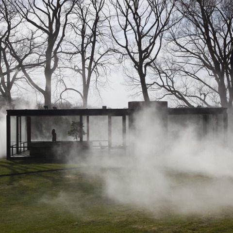 Como ya anunciamos en febrero (ver, Equilibrio de opuestos. La Glass House presenta Veil de Fujiko Nakaya.) hoy primero de mayo de 2014, Fujiko Nakaya, una artista japonesa conocida internacionalmente por sus "esculturas de niebla", inicia la instalación (que se repetira todos los días hasta noviembre) para envolver en una densa y fantasmagórica capa de niebla, la Glass House / Casa de Cristal diseñada por Philip Johnson in 1949, en New Canaan, Connecticut, EE.UU.