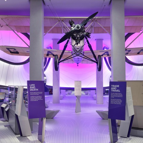 Las matemáticas también definen el diseño esclarecedor de Zaha Hadid Architects para la galería. Inspirado por el avión Handley Page, el diseño está impulsado por las ecuaciones de flujo de aire utilizadas en la industria de aviación. La disposición y las líneas de la galería representan el aire que habría fluido alrededor de este histórico avión en vuelo: desde el posicionamiento de las vitrinas y bancos hasta las superficies curvas tridimensionales de la estructura del espacio central.