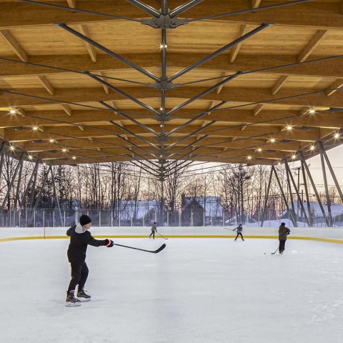 La tarea era proporcionar un espacio protegido durante el invierno y el verano. Tiene una gran superficie cubierta que sirve como pista de patinaje en invierno y se puede utilizar para hockey sobre hielo o baloncesto en verano.