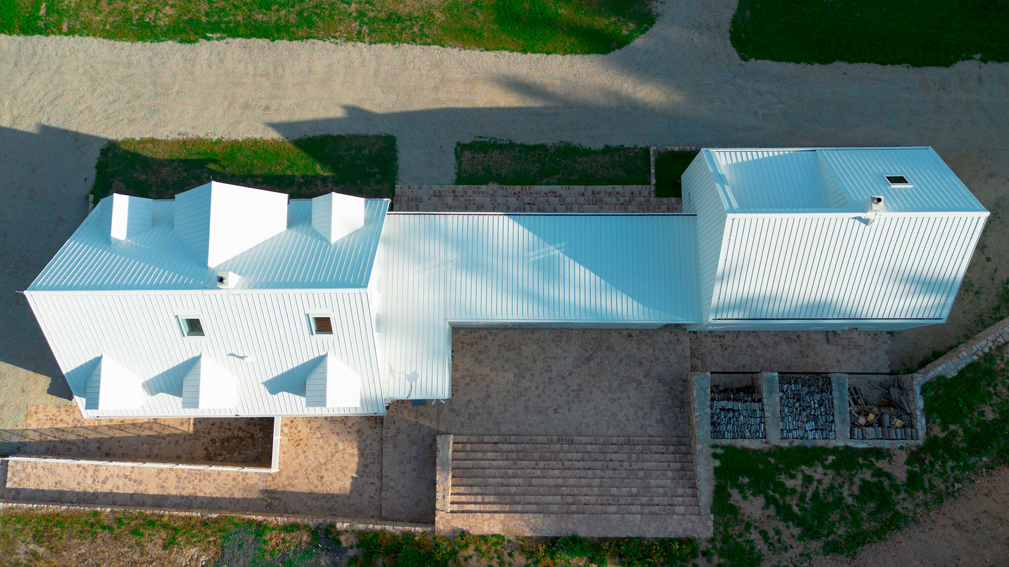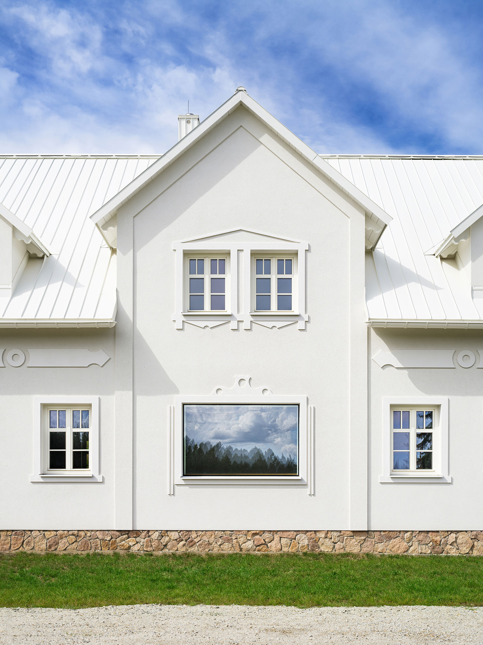 Elegimos el blanco para la nueva vida del complejo. Un blanco radical, incluso en la grava de los caminos de tierra. Colocamos una resistente cubierta de acero blanco sobre el antiguo edificio, que, a través del tejado de madera que conecta con la ladera, se transforma en una reluciente estructura de acero blanco en el nuevo edificio. Cubrimos las ventanas con vidrio irrompible y las enmarcamos con hierro indestructible. Luego, colocamos todo esto sobre una base de piedra local de los Montes Metálicos, vestigios del pasado. Salpicamos los alrededores con senderos de grava blanca en algunos puntos, añadiendo una pequeña playa junto al estanque.
