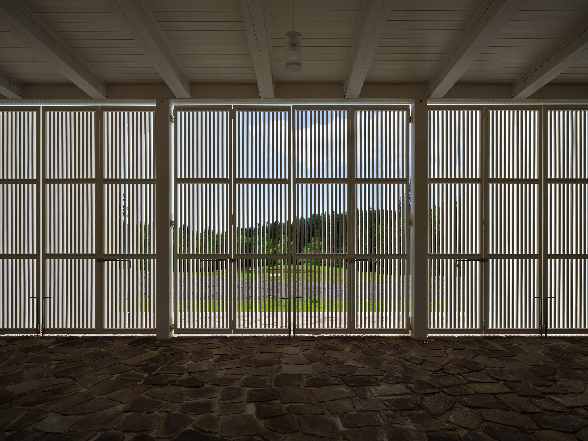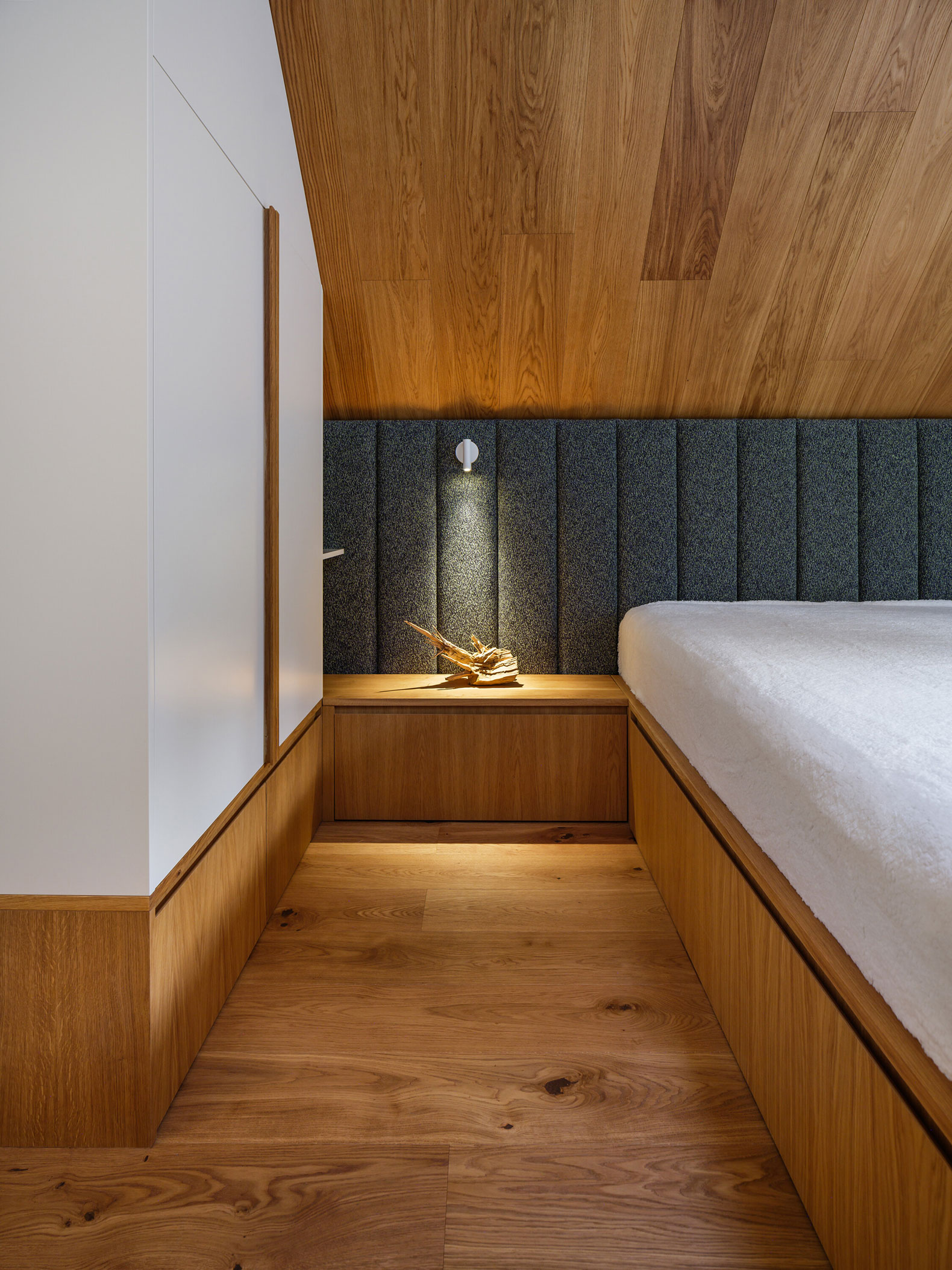Por lo tanto, enterramos las tuberías de un colector subterráneo bajo la amplia pradera frente a la casa.La energía acumulada en la ladera gracias al breve sol de verano se utiliza para calentar los edificios y el agua de un pozo recién perforado, que desemboca en una planta de tratamiento de raíces. Todo esto se alimenta con electricidad procedente de una planta fotovoltaica ubicada en el tejado verde del antiguo edificio agrícola. La electricidad se suministra a través de la sala de máquinas situada en el sótano recientemente ampliado del edificio original. Todo en la casa, desde las cámaras y las luces hasta las cerraduras y las persianas, se puede controlar a distancia mediante un complejo sistema integrado conectado por satélite. La calefacción por suelo radiante, estable y de baja temperatura, se complementa con grandes chimeneas integradas, que proporcionan el tipo de radiación térmica con la frecuencia de la luz solar, tan necesaria en la montaña durante el invierno. Y en caso de emergencia, el depósito subterráneo contra incendios, situado bajo el aparcamiento, suministrará agua para extinguir incendios no solo para todo el complejo, sino también, en combinación con el humedal reconvertido en estanque, para los bosques más cercanos.