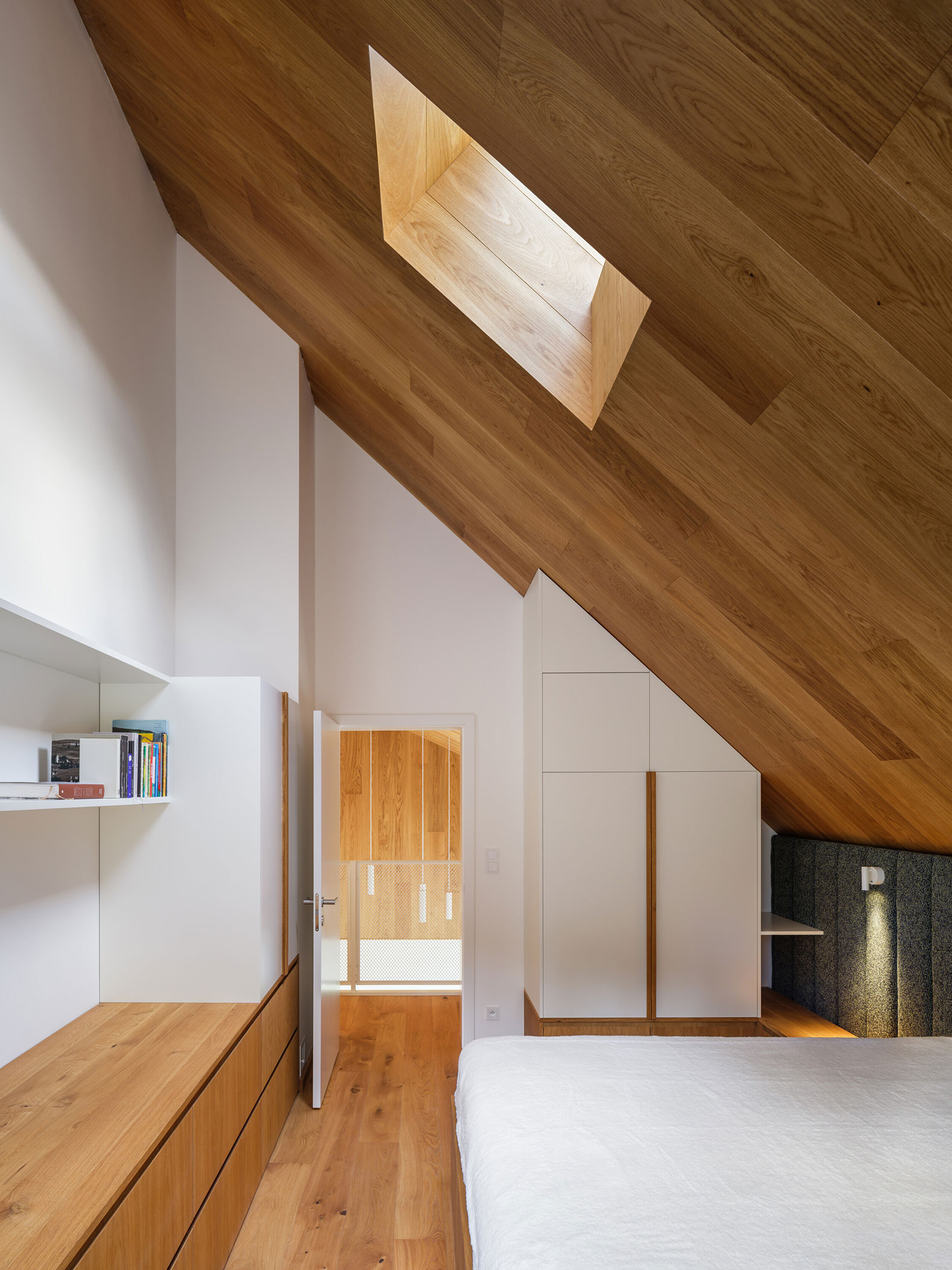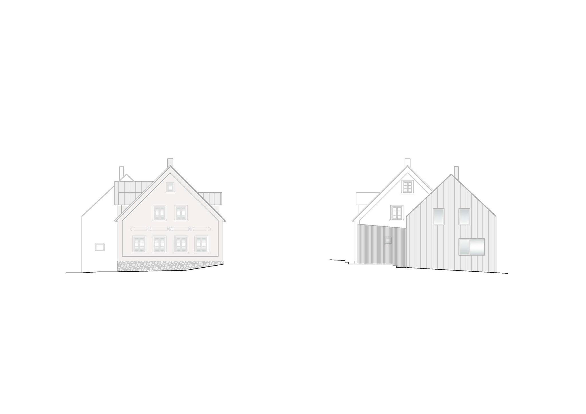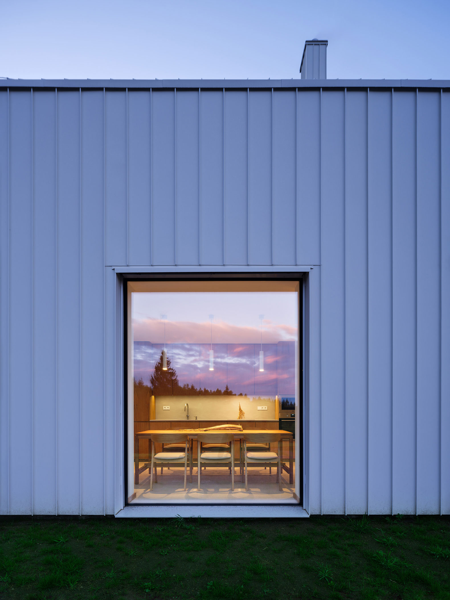 Pero todo comenzó con la demolición. Derribamos y retiramos todas las estructuras dispersas por la pradera que no estaban allí antes de la desaparición de la soledad original. Tomamos prestadas las piedras adecuadas. Luego, unificamos el nuevo programa de construcción en un único volumen coherente, contrastando la dignidad de la antigüedad con la vitalidad de la juventud. Lo que no encajaba, lo enterramos sin piedad en la ladera, de modo que solo quedó una granja en pie, entre el conjunto de casas. Esta granja consta de una casa antigua y otra nueva conectadas por una terraza cubierta y cerrable, con un techo fusionado en una sola capa resistente a la intemperie. Intensificamos la tectónica de chapa metálica con tiras inusualmente estrechas de chapa hecha a medida y múltiples juntas.