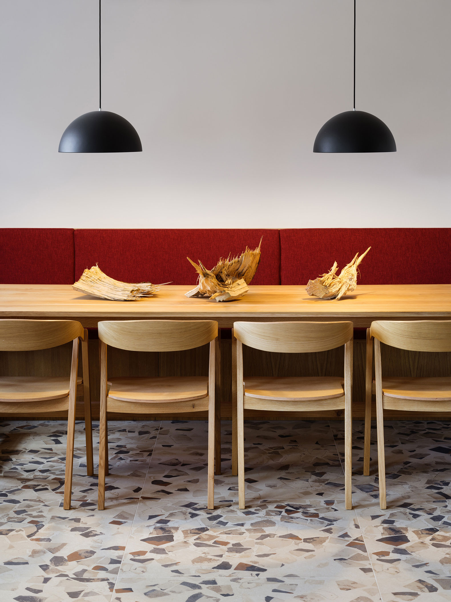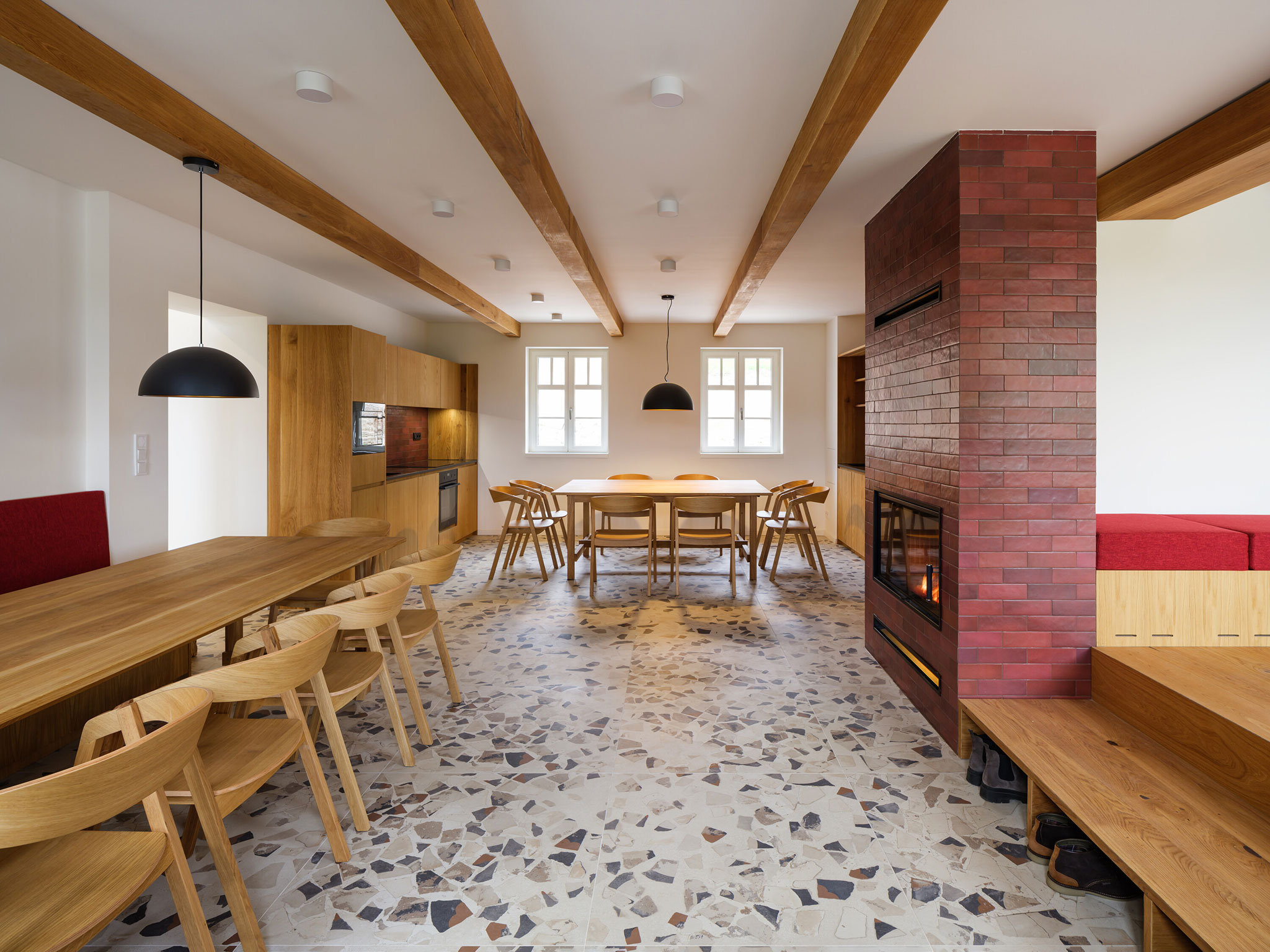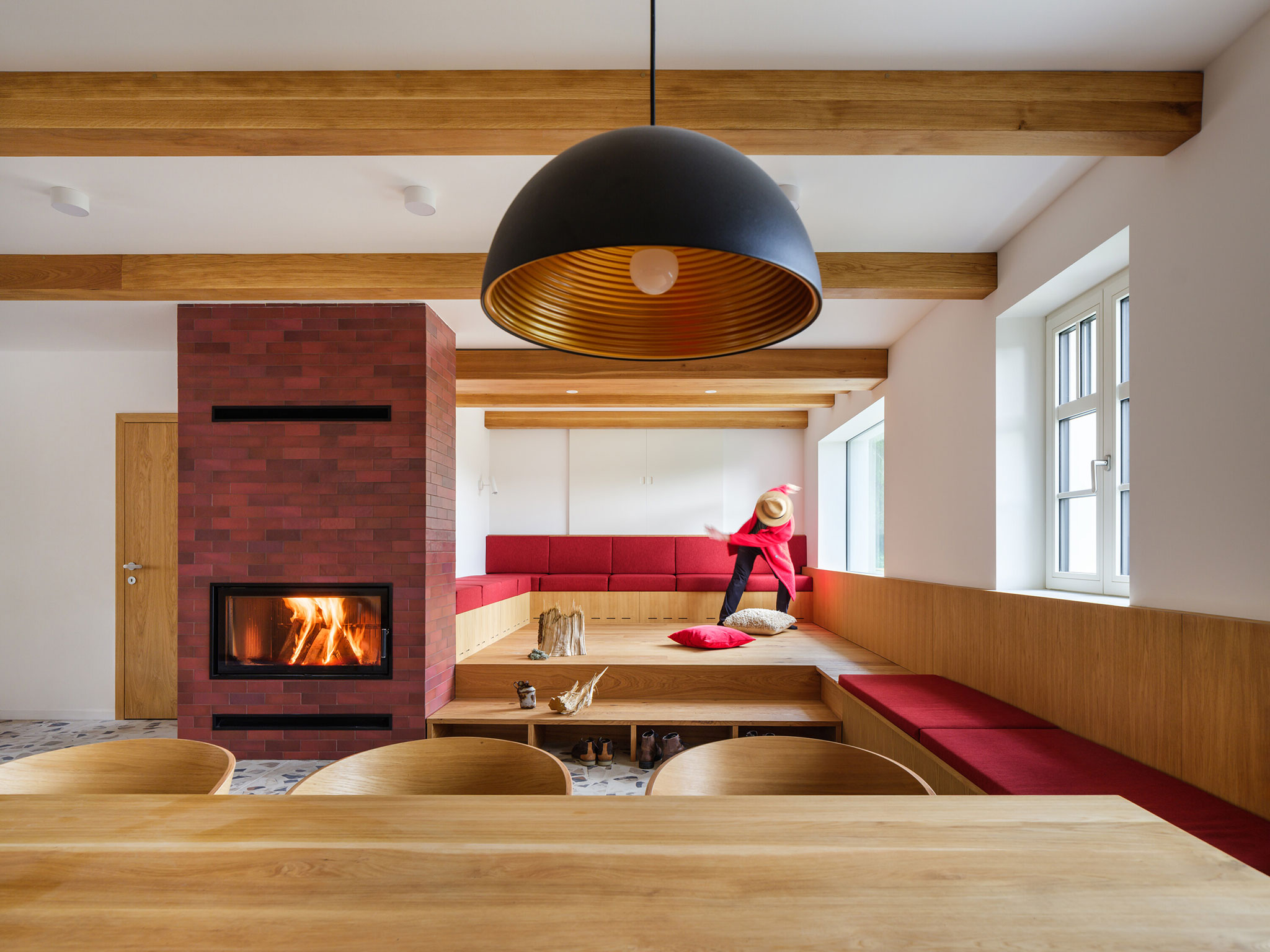 Las zonas comunes —los interiores de los apartamentos y la casa del conserje— están diseñadas para ser sencillas y acogedoras, pero también resistentes al uso intensivo por parte de los visitantes. Esto incluye incluso a los visitantes más exigentes: niños bulliciosos que corretean alegremente, con el pelo cubierto de humo, los dedos pegajosos de resina y, de vez en cuando, sosteniendo algún hermoso objeto natural en sus manos.