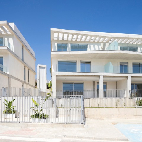 The 66 apartments with terraces are arranged in three longitudinal volumes with three storeys, which are broken up to adapt to the sloping terrain of a hillside facing the Mediterranean Sea. Two of the buildings fold into their central axes of communication, making them traversable, in order to fit the topography and have a view of the sea. The third block is separate, thus freeing the facade and making it more permeable. The zigzagging volumes are the second phase of a residential development that has a communal swimming pool and gardens. The shape of the blocks gives them movement that is also conferred, like a ripple effect, to the terraces and the running second-floor pergolas, creating an apparent continuity of movement between the flow of the buildings and the inward and outward projections of the tray-like terraces and pergolas made of exposed concrete.