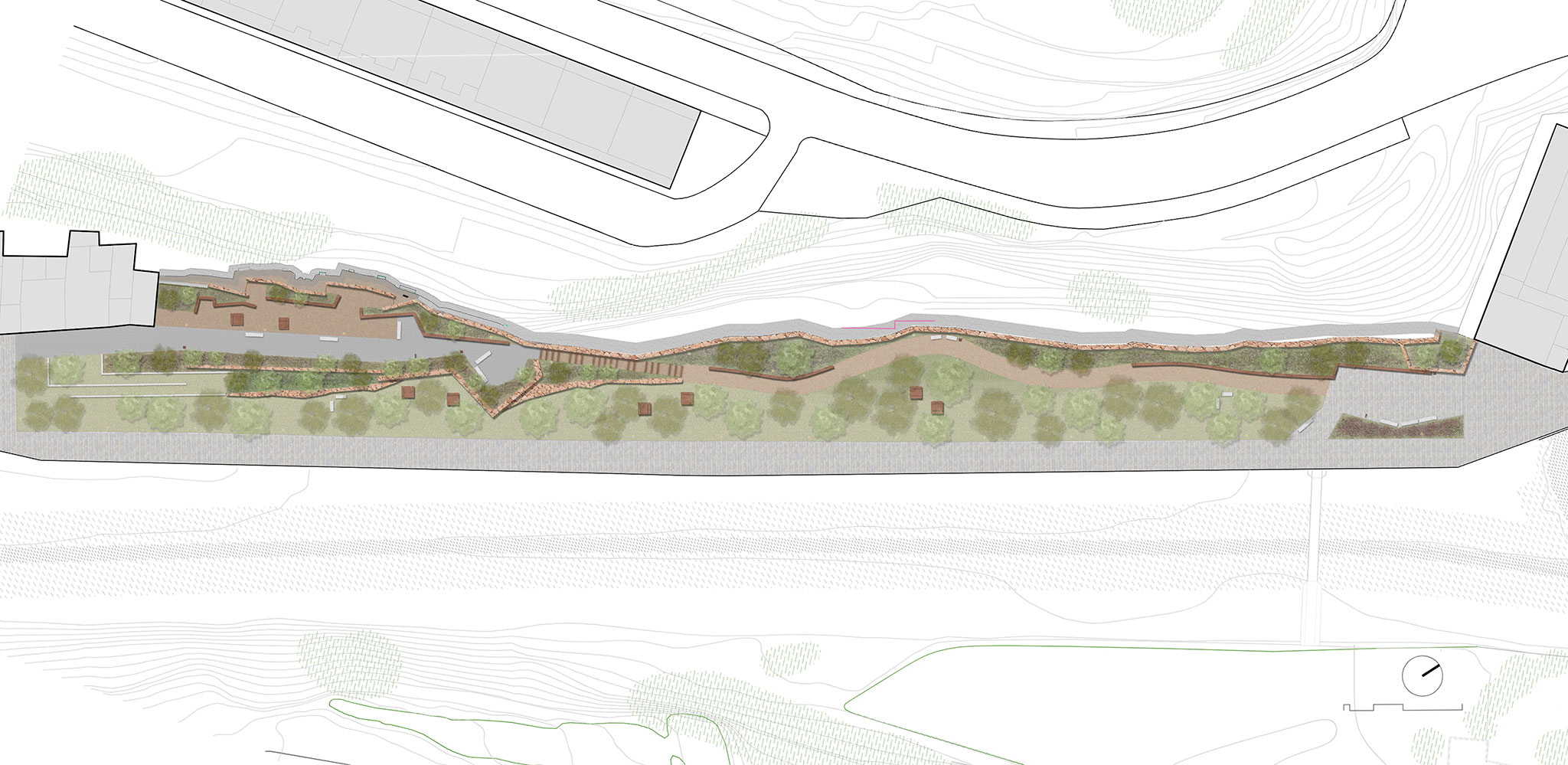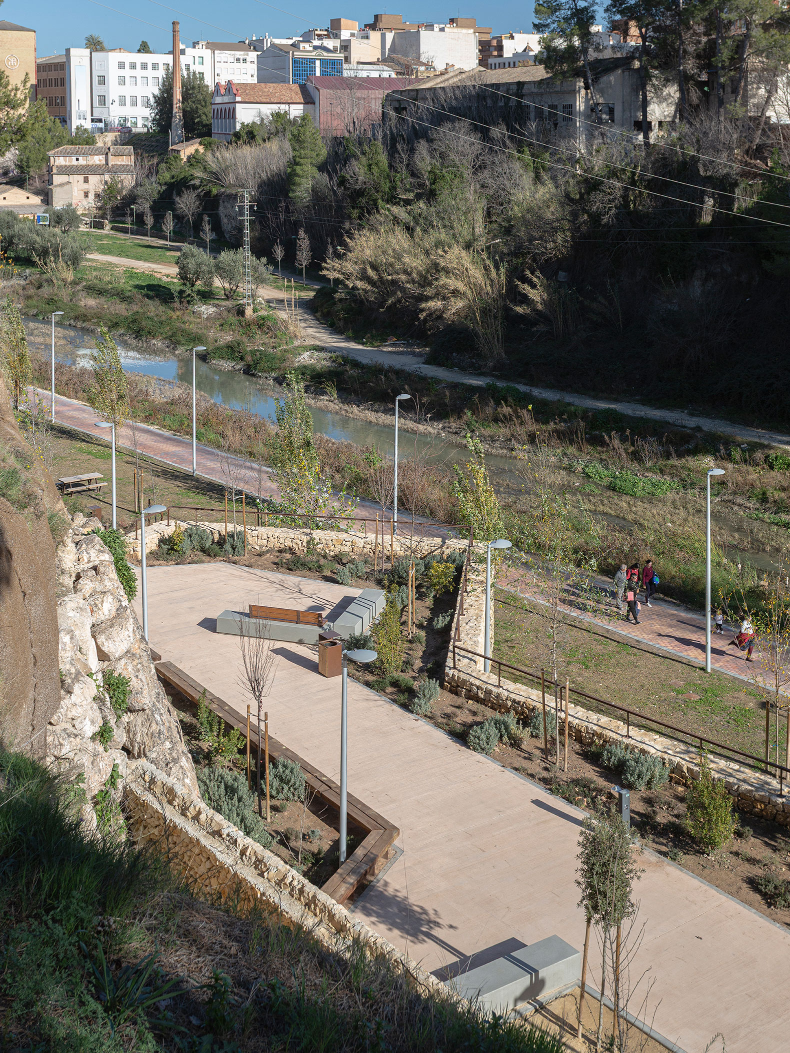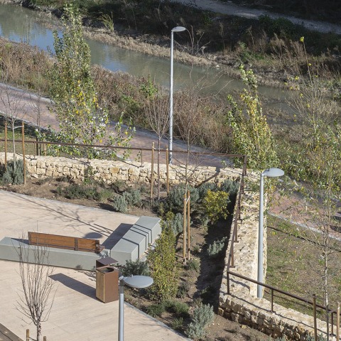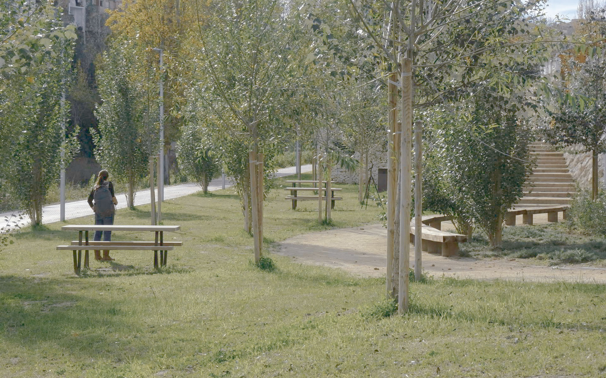 El parque tiene un marcado trazado lineal, delimitado entre el lecho del río y el talud posterior, sus dos extremos enlazan con la trama urbana: al Este, la plaza vinculada al Matadero y a la recepción de la pasarela en construcción que conectará ambas orillas del río; al Oeste, una serie de gradas vegetalizadas que adaptan el desnivel entre la calle y la plataforma elevada protegida de riadas. Se extienden a cota inundable un bosque de ribera y pradera natural atravesadas por un sendero que invita al paseo y a descubrir diferentes vistas del cauce y la ciudad desde una sutil elevación que dinamiza el paso entre los árboles.
