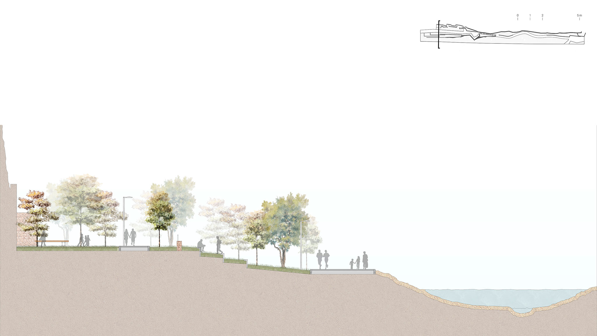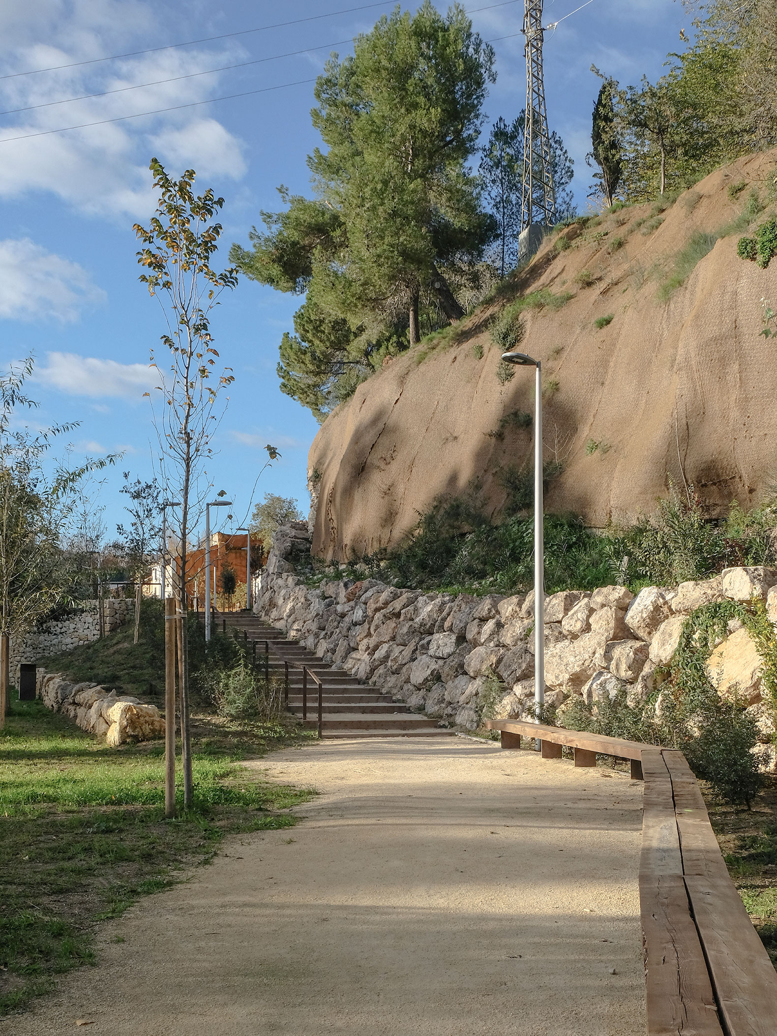 Taludes vegetalizados, rocallas, plataformas en gradería y una escalera de enlace con el sendero, engarzan ambos niveles de la intervención diluyendo su transición. Pavimentos permeables, bancos poligonales que acotan alcorques, vegetación que protege desniveles, piedra que amuralla, intencionada sobriedad de materiales y elementos compositivos.