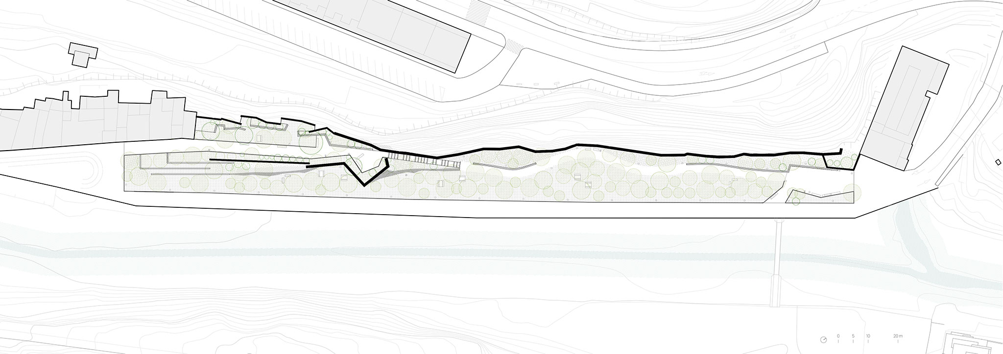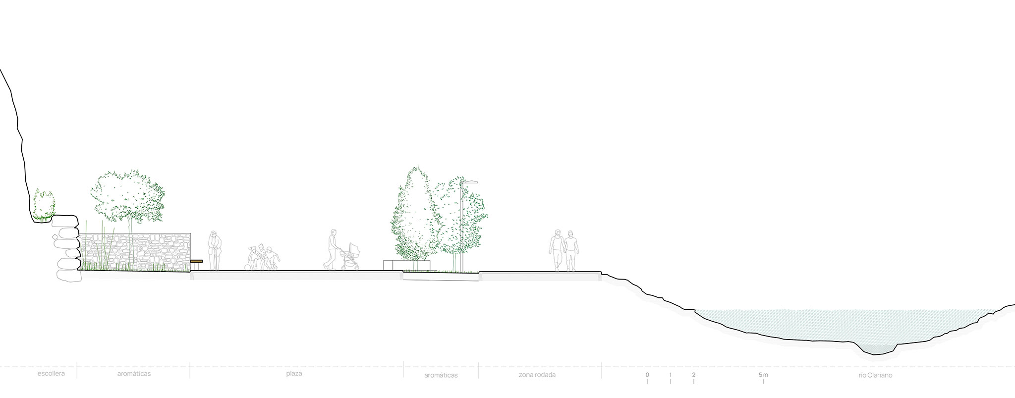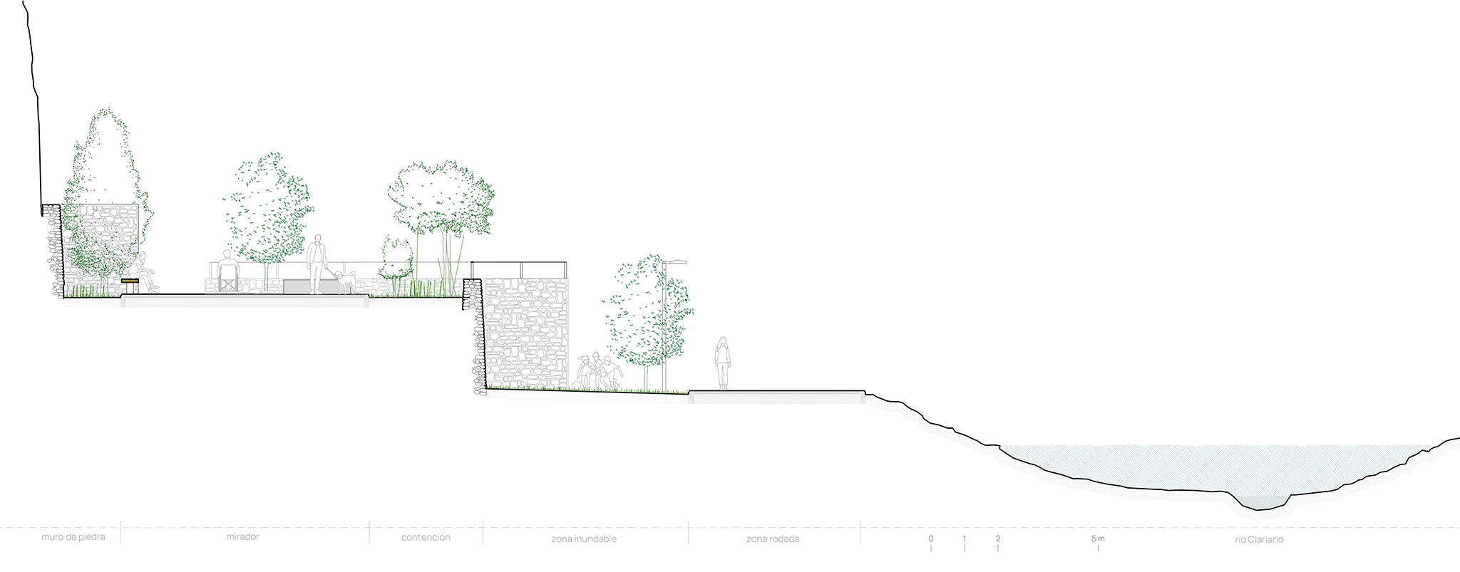 El muro de mampuestos que constituía el cerramiento y contención de una industria demolida entre la plataforma elevada y la zona inundable, se incorpora al diseño y sirve de guía para ampliar su trazado con la misma tradición de los muros de abancalamiento. Así, la mampostería conforma un mirador de trazado geométrico, encajonando la plataforma superior como una atalaya. Se extiende esta misma solución como fondo escénico y protección de las cuevas excavadas en la ladera, actuando de barrera frente al desprendimiento de derrubios del talud posterior.
