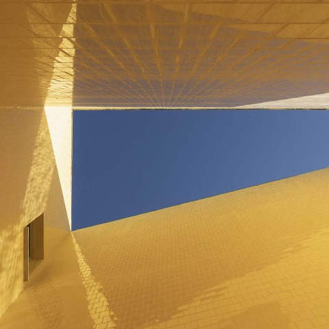 Para comunicar el espacio exterior con el interior proyecta un intervallum que se abre en fachada, alicatado con unos brillantes azulejos amarillos y que funciona como eje de conexión entre ambas edificaciones.