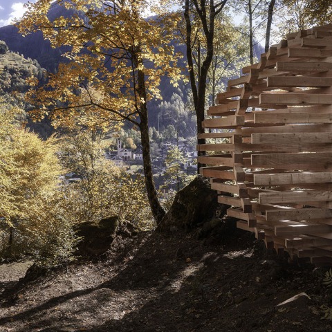 Ubicado en el bosque del pueblo de Rossa, en el Valle de Calanca, el proyecto, realizado por Davide Macullo Architects con el apoyo de la Fundación RossArte, el municipio de Rossa y el Parque Nacional Suizo Val Calanca ha involucrado a los habitantes del valle, visitantes e instituciones en el trabajo hacia un objetivo común y contribuye al debate sobre la mejora de las zonas rurales. Uno de los principales objetivos de RossArte es fomentar una sana ambición de crecimiento social, económico y cultural para el futuro de la región. Estas arquitecturas / esculturas forman parte del trabajo más amplio de la fundación, dando a Rossa y Val Calanca una identidad como destino para el trabajo y la vida, así como para el turismo.
