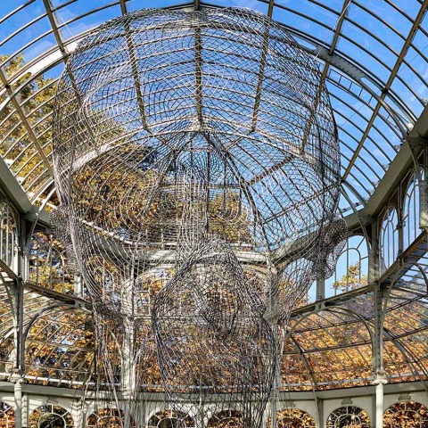 Jaume Plensa presenta un grupo de esculturas realizado por mallas de acero que atrapan en el espacio los rostros inacabados de figuras suspendidas en el aire, atravesadas por la luz en un juego inteligente de transparencias con el pabellón de cristal.