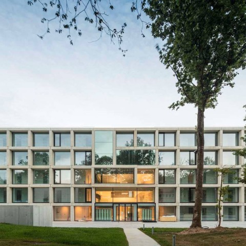 Mientras que los laboratorios, que apenas admiten la luz del día, están situados en el largo lado norte del edificio detrás de un elegante muro cortina, la fachada sur alberga las áreas de oficinas, donde los postes y dinteles de hormigón sólidamente apilados forman un patrón de rectángulos. La grilla se destaca por sus rellenos acristalados tipo nicho, colocados a 80 centímetros de profundidad en la fachada. Las amplias ventanas del piso al techo ofrecen impresionantes vistas del paisaje circundante. La entrada, situada en el medio de esta fachada, se hace inmediatamente evidente por la desviación del patrón y la entrada acristalada, que ha sido ligeramente adelantada.