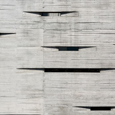 Una parte de la fachada se realiza en hormigón visto con pequeñas aberturas que son utilizadas como focos luminosos a algunas zonas de circulación del edificio. El resto de las superficies de fachadas están revestidas verticalmente con franjas de travertino a través de diversos anchos, produciendo una fachada con un juego constante de luces y sombras.