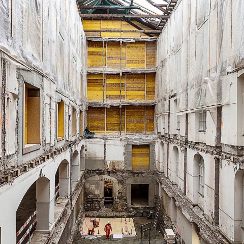 El centro del edificio se está convirtiendo en un gran espacio público interior, llamado Plaza. El núcleo del sitio, este alto espacio abierto de tres pisos, se convertirá tanto en su núcleo de circulación central como en la puerta de entrada pública desde el Rin al edificio y al parque. Abordando la necesidad de integrar varios caminos nuevos con los dos lados del edificio, FDRS está introduciendo dos pasajes adicionales en la periferia de la estructura y ampliando todas las ventanas de la planta baja para que se conviertan en puertas, haciendo que el edificio sea abierto, poroso, accesible y lleno de vida que se derrama en la ciudad.