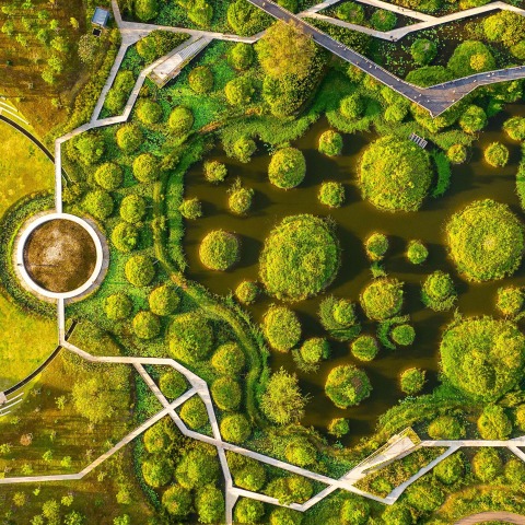 Parque Nanchang Fish Tail, Nanchang, provincia de Jiangxi, 2022. Un bosque flotante de 51 hectáreas (126 acres) en la capital provincial recuperó una antigua piscifactoría contaminada y un vertedero de cenizas de carbón. Docenas de pequeñas islas plantadas con secuoyas y dos tipos de cipreses, algunas de las cuales están rodeadas por masas gigantes de lirios amarillos, ayudan a regular las aguas pluviales, proporcionan hábitat para la vida silvestre y ofrecen una variedad de oportunidades escénicas y recreativas. Una red de pasarelas conecta con puentes, plataformas, pabellones y torres de observación que están estratégicamente ubicadas para vistas clave y puntos focales.