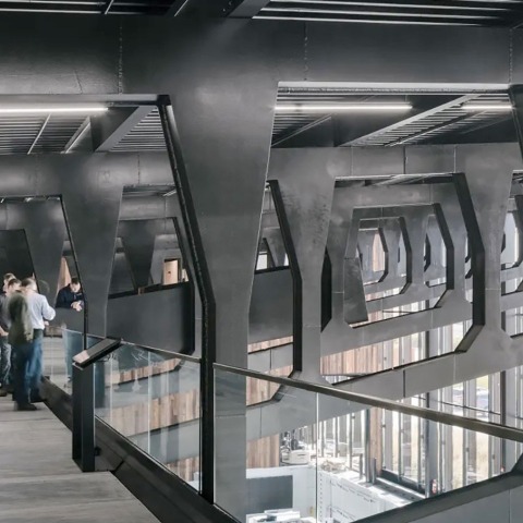 Destacándose entre los blandos parques de oficinas y los almacenes sin rostro a lo largo de la I-90, justo al noroeste de Chicago, Smart Factory alberga una sala de exposición prototípica de máquinas herramientas avanzadas utilizadas para plegar y dar forma a la hoja de metal. Posicionado estratégicamente cerca del Aeropuerto Internacional de Chicago O'Hare, ocupa una parcela de tierra reclamada de un campus corporativo abandonado. Guiada por la creencia del cliente de que una buena arquitectura mejora todos los lugares de trabajo y, por lo tanto, sus productos, la fábrica posiciona a la compañía en uno de sus mercados más importantes.