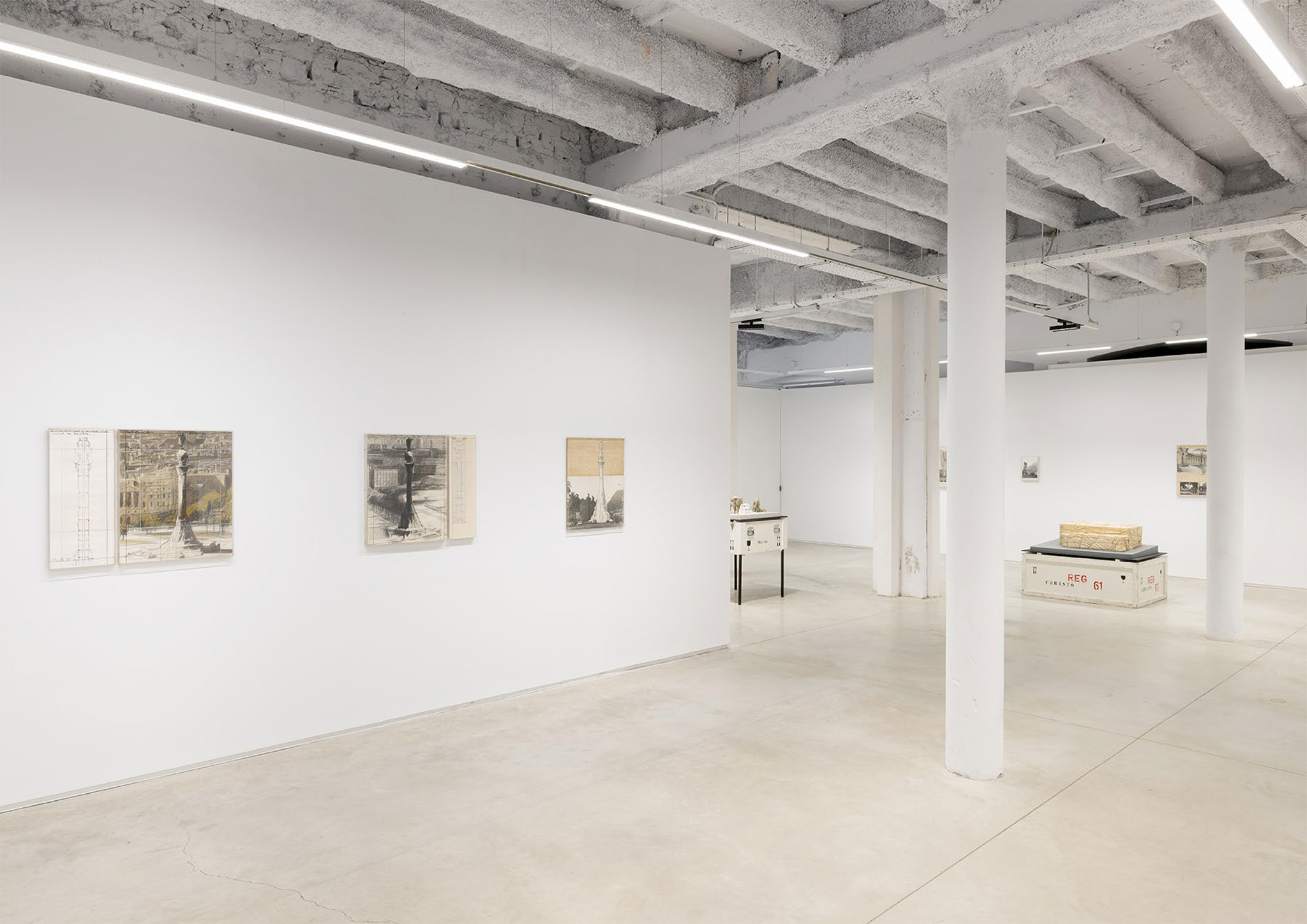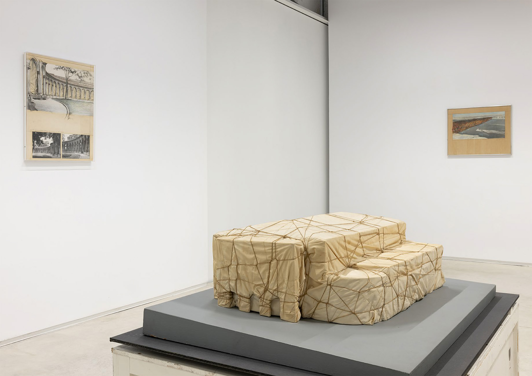 Christo y Jeanne-Claude. Monumento envuelto a Cristóbal Colón (Proyecto para Barcelona-Passeig de Colom, plaza Porta de la Pau), 1975. Grafito, carboncillo, cartulina, tela e hilo sobre papel. 72 × 56,5 × 4 cm (28 ⅜ × 22 ¼ × 1 ⅝ pulgadas) (enmarcado). Cortesía por la Fundación Christo y Jeanne-Claude / Prats Nogueras Blanchard Barcelona/Madrid.