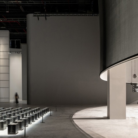La escenografía propuesta por OMA divide el espacio expositivo en dos partes complementarias: