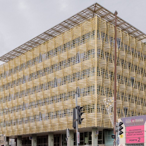 Nuestro enfoque consistió en encontrar un lenguaje que nos permita tratar la envolvente como un todo, sin concretar los elementos arquitectónicos. Antepechos, marcos o incluso la lectura de los pisos se desvanecen para permitir crear una propuesta abstracta. La materialización de esta abstracción implica la creación de una doble piel que envuelve el edificio. Hemos propuesto una doble piel metálica de aluminio anodizado, concebida y proyectada como una estructura tejida que permite controlar la incidencia de la radiación solar durante todo el año, optimizando así el confort de los ocupantes.