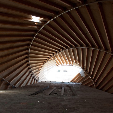 El pabellón helicoidal de madera era un espacio algo etéreo, un poco mágico e hipnótico pues la luz bañaba la madera de forma irregular y las costillas proyectaban sus sombras impredeciblemente consiguiendo que el visitante perdiera algo la dimensión del lugar ya que sus límites se hacían difusos. “Cuando estabas dentro soñabas despierto y cuando salías te dabas cuenta de que aquello acabaría en una pesadilla”, concluye Nathalie Gidrón.