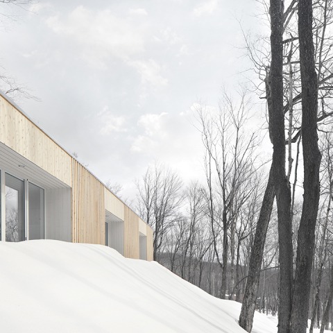 El muro exterior, enteramente cubierto con paneles de cedro en vertical, envejecerá progresivamente con los años, emulando el color de las cortezas de los árboles. Algunas secciones de estos muros están cubiertas con listones de madera, por tanto crean un sutil relieve en las fachadas que interactúa con el ritmo vertical del bosque cercano. En la cubierta, una cama de guijarros arroja color que puede ser visto desde las zonas cercanas; por lo tanto, la estructura se vuelve difícil de disntingir del entorno cuando se observa desde la parte alta de la colina.