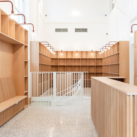 En esta zona de acceso encontramos el hall de entrada, la taquilla, la librería y un nuevo gran café. En la antigua casa particular ahora se encuentran los espacios educativos, el salón de usos múltiples y las oficinas.