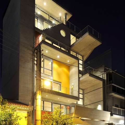 El bloque de apartamentos se encuentra en el área de Gazi, vecino de Kerameikos. La propuesta fue concebida como una disolución de las fuertes fronteras de una "caja" elementalmente habitable y la idea de una composición abierta, fluida de plataformas. La caja envolvente conserva los procedimientos controlados y sensibles de la vivienda en este proyecto de multi-vivienda se "abre" hacia el exterior consiguiendo una condición de vivienda extravertida multi-habitacional. Haciéndolo así, se crean relaciones diagonales en contrapunto entre coexistencia y cohabitación mutua tanto con la composición como con el espacio público de la ciudad. La idea de disolución y destape del espacio interior de la "caja" se acentúa por la interrelación pura entre planos horizontales y verticales articulados entre ellos en la formación de la forma del proyecto. Estas plataformas no son interrumpidas por la fachada pero si que penetran, deslizando - como "cajones" dentro del proyecto, moldeando el espacio habitable. Así, esta composición abierta, fluida no es un gesto estética de la piel de edificio, carente de profunidad, ya que esto implica un movimiento estructural poderoso en el espacio interior.