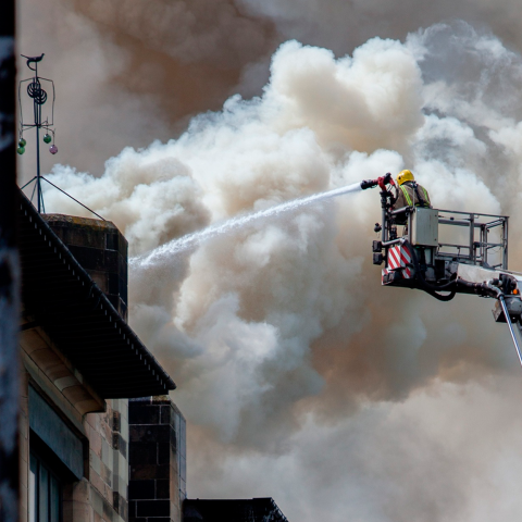 Testigos presenciales dijeron que el incendio parece haber comenzado cuando un proyector explotó en el sótano del edificio de Charles Rennie Mackintosh justo antes de las 12:30.