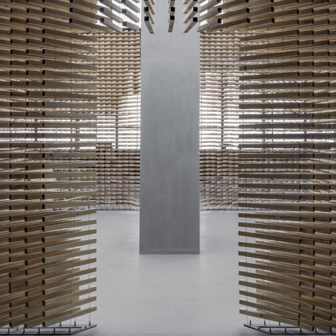 Un bloque de 19 metros de largo de estantes de exhibición de malla suspendida recorre todo el espacio como una espada de doble filo, formando un contraste agudo pero armonioso con el Nido y liberando una experiencia multidimensional y un orden espacial muy tenso.