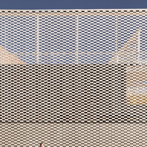 Estos paneles mixtos de hormigón y plaquetas cerámicas situados en el zócalo del edificio contemplan una novedad técnica importante: dado el armado interno del tejido cerámico no contienen un marco perimetral de hormigón por lo que las piezas cerámicas pueden llegar a los extremos del panel. Esta innovación ha posibilitado la continuidad del dibujo en damero del patrón del tejido para las tres situaciones diferentes de fachada.