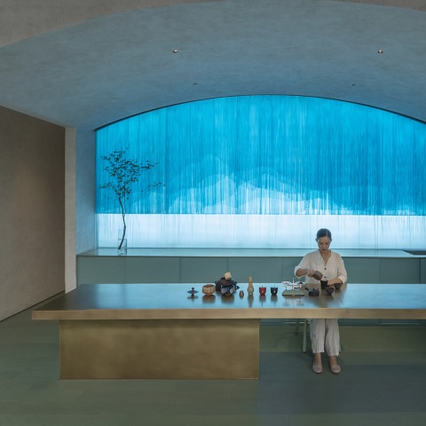 El área de descanso para tomar té en el otro lado utiliza 6 capas y decenas de miles de varillas acrílicas azules de diferentes tonos y dispuestas en collage con iluminación para representar el ritmo de la montaña, la niebla y la lluvia. Los materiales contemporáneos se utilizan para reflejar las salpicaduras de tinta y agua con significado chino y el estado de ánimo sobrio. Grandes ventanas de piso a techo y la arquitectura e instalaciones minimalistas se utilizan para bloquear el ruido exterior y crear tranquilidad.
