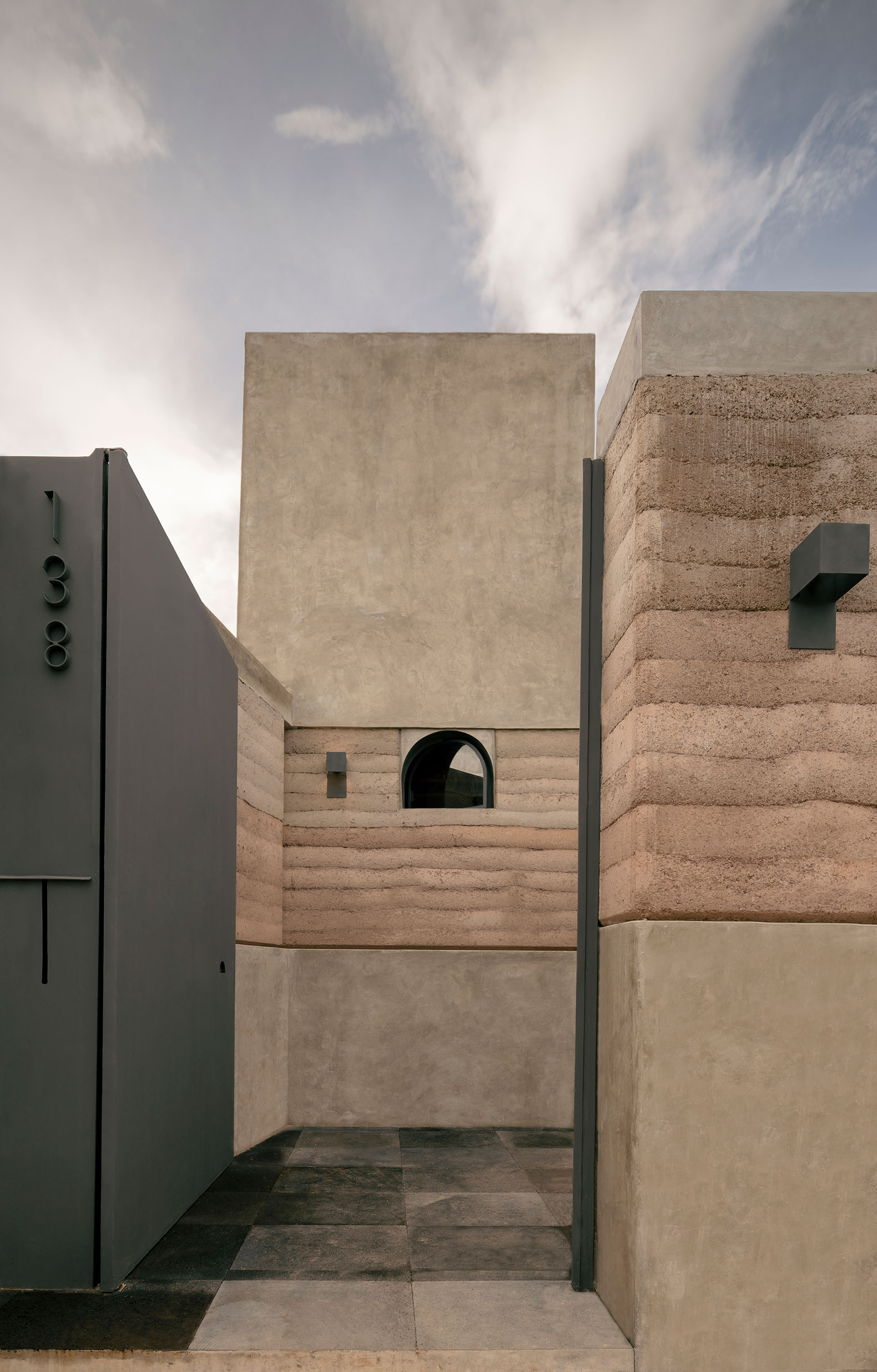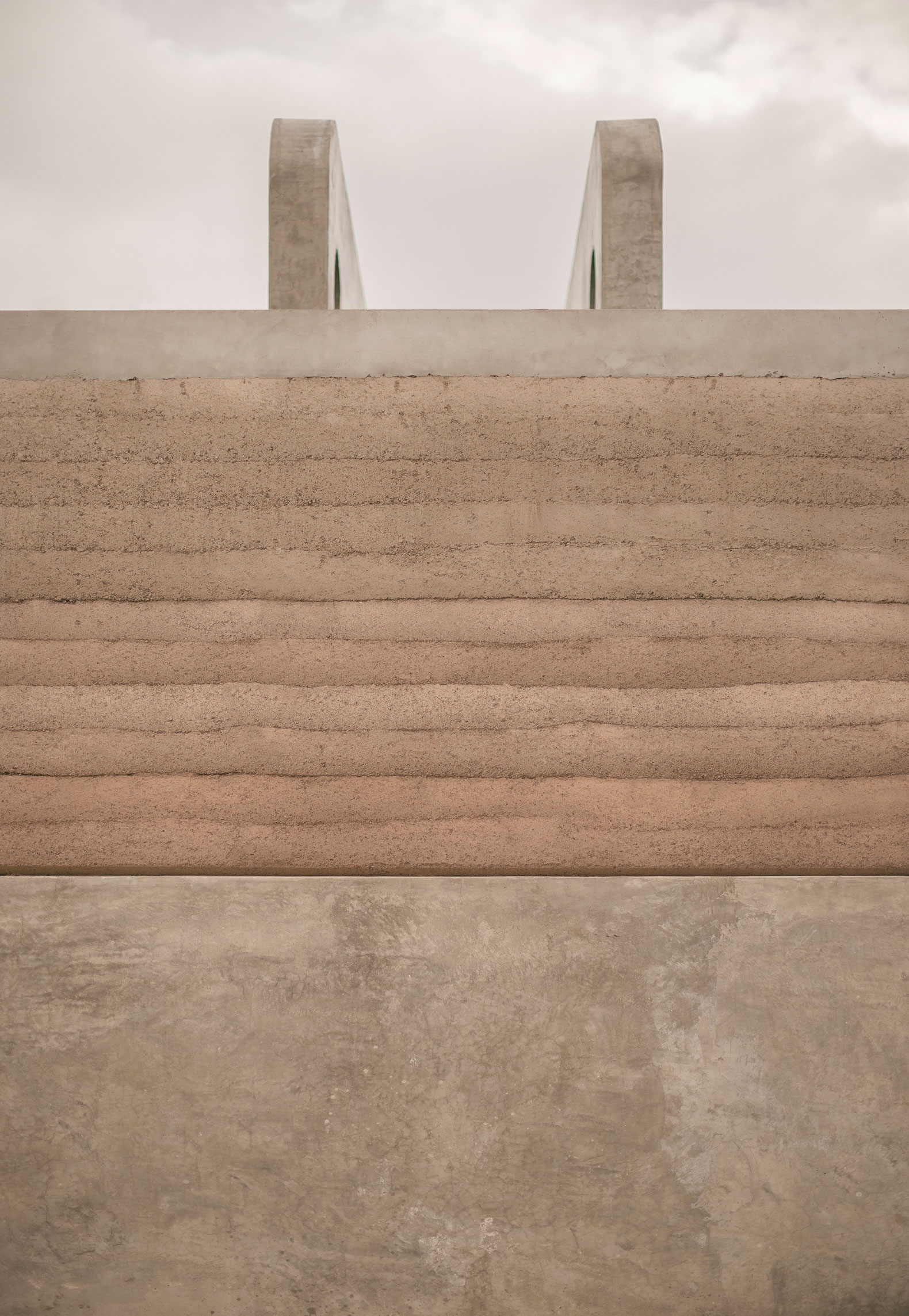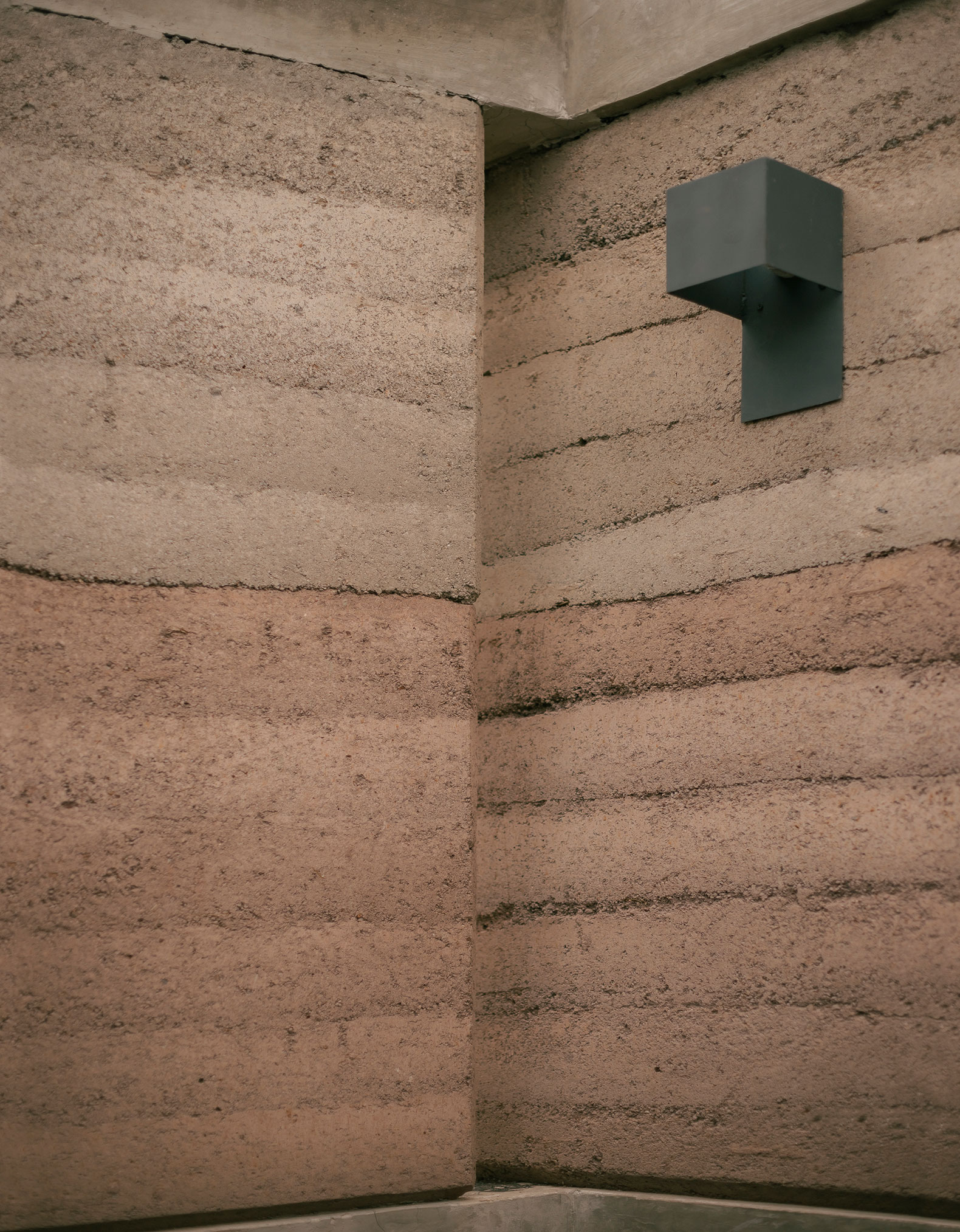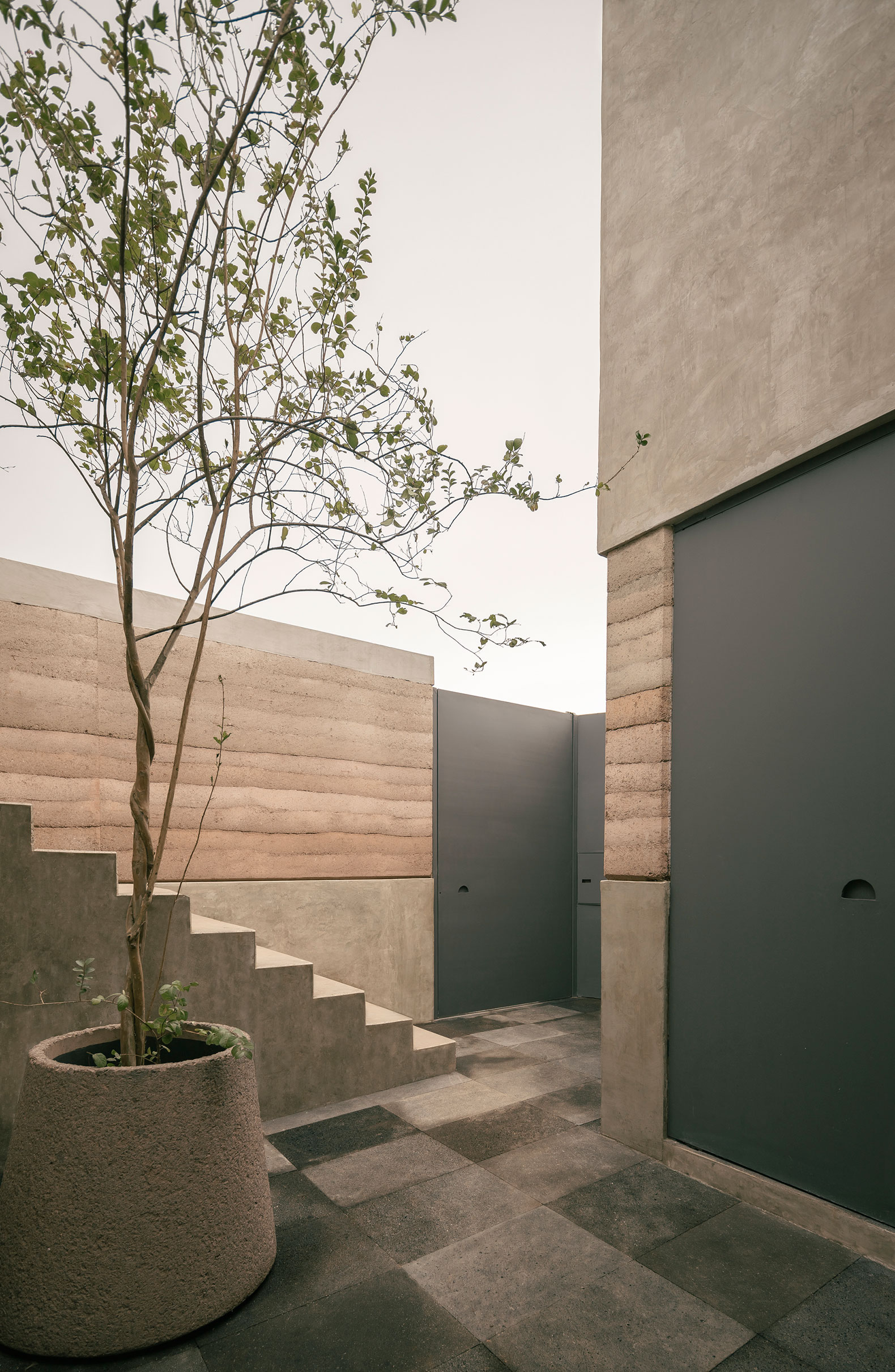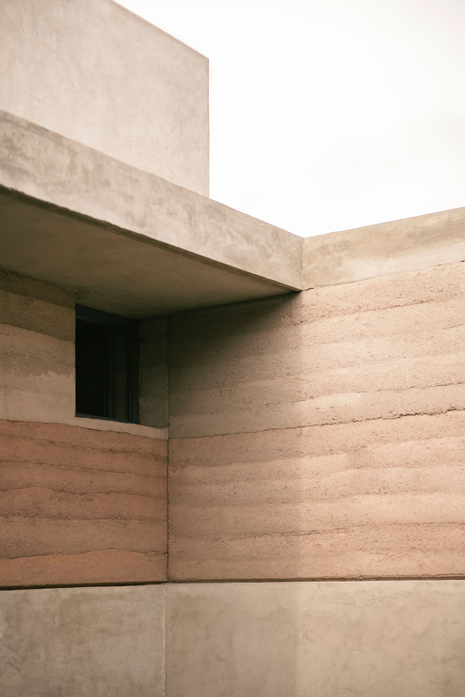 En los muros vemos un sistema antiguo de tierra apisonada, fusionada con técnicas contemporáneas de colado de concreto que nos habla de lo atemporal que es la arquitectura cuando se selecciona el diseño y la materialidad adecuada para el proyecto., se combinó el uso de muros de concreto y muros de tierra apisonada, de esta forma la función de estos muros no se queda tan solo como estructural, al incorporar estas técnicas de construcción permitimos generar atmosferas aislantes térmicas y acústicas, que además de ser funcionales, generan muy buen contraste con el piso de piedra negra recinto, la ventanería de herrería, y los acabados de muebles en carpintería y barras de cemento pulido, logrando una paleta monocromática pero con acentos sutiles que nos muestran gran honestidad en los materiales.