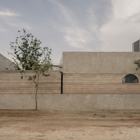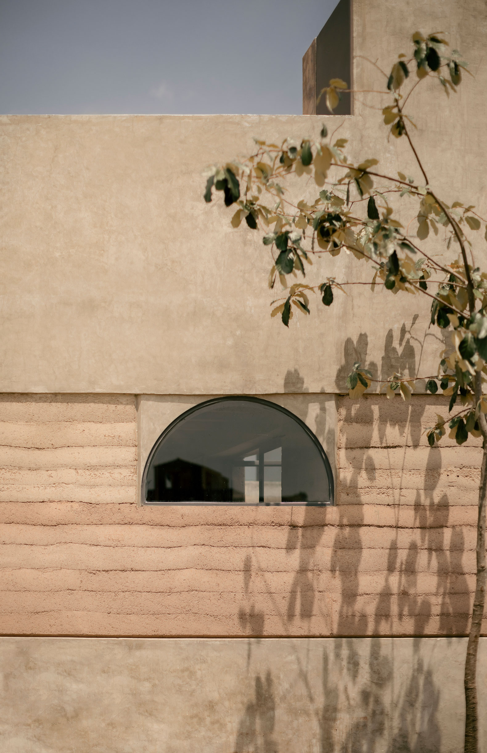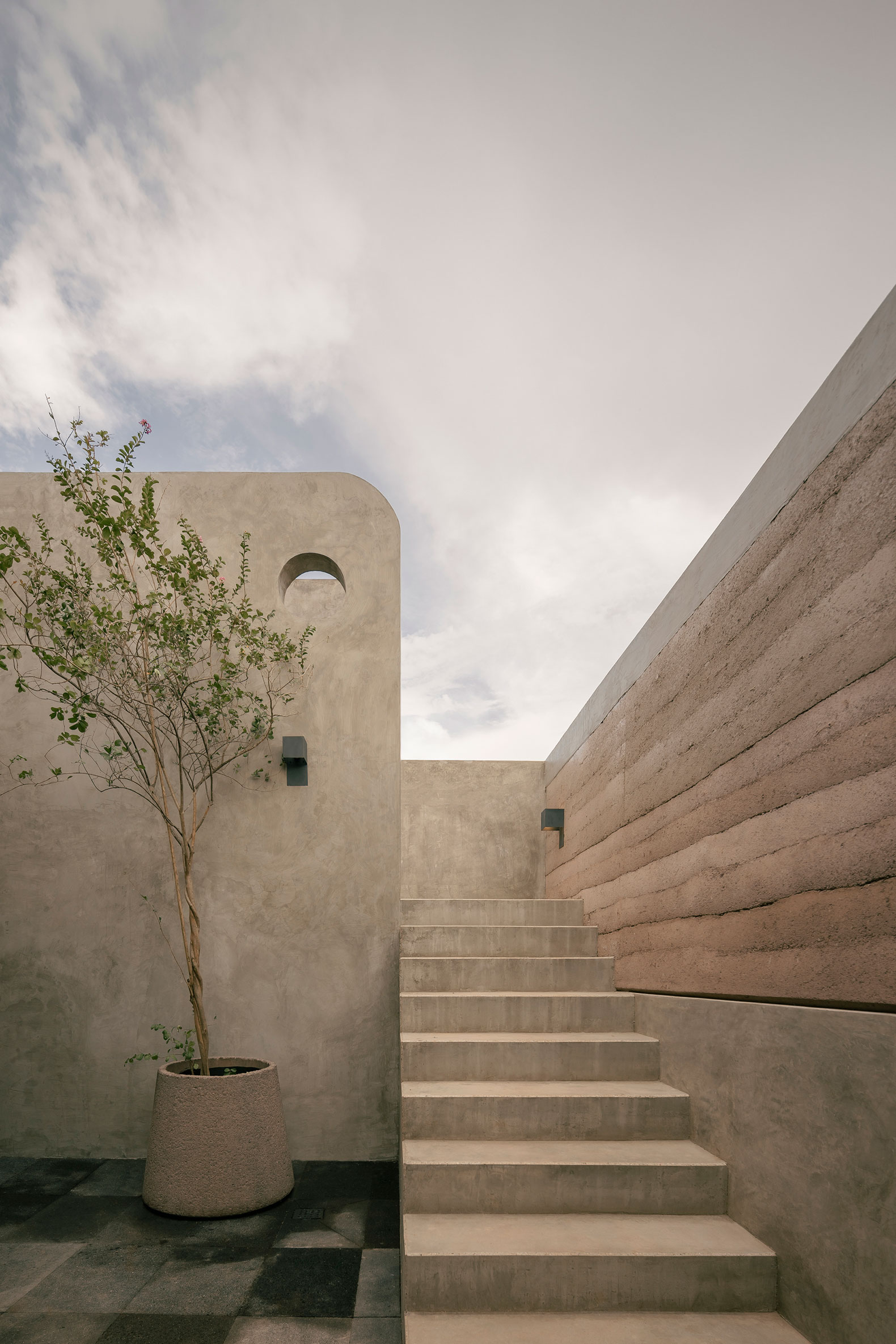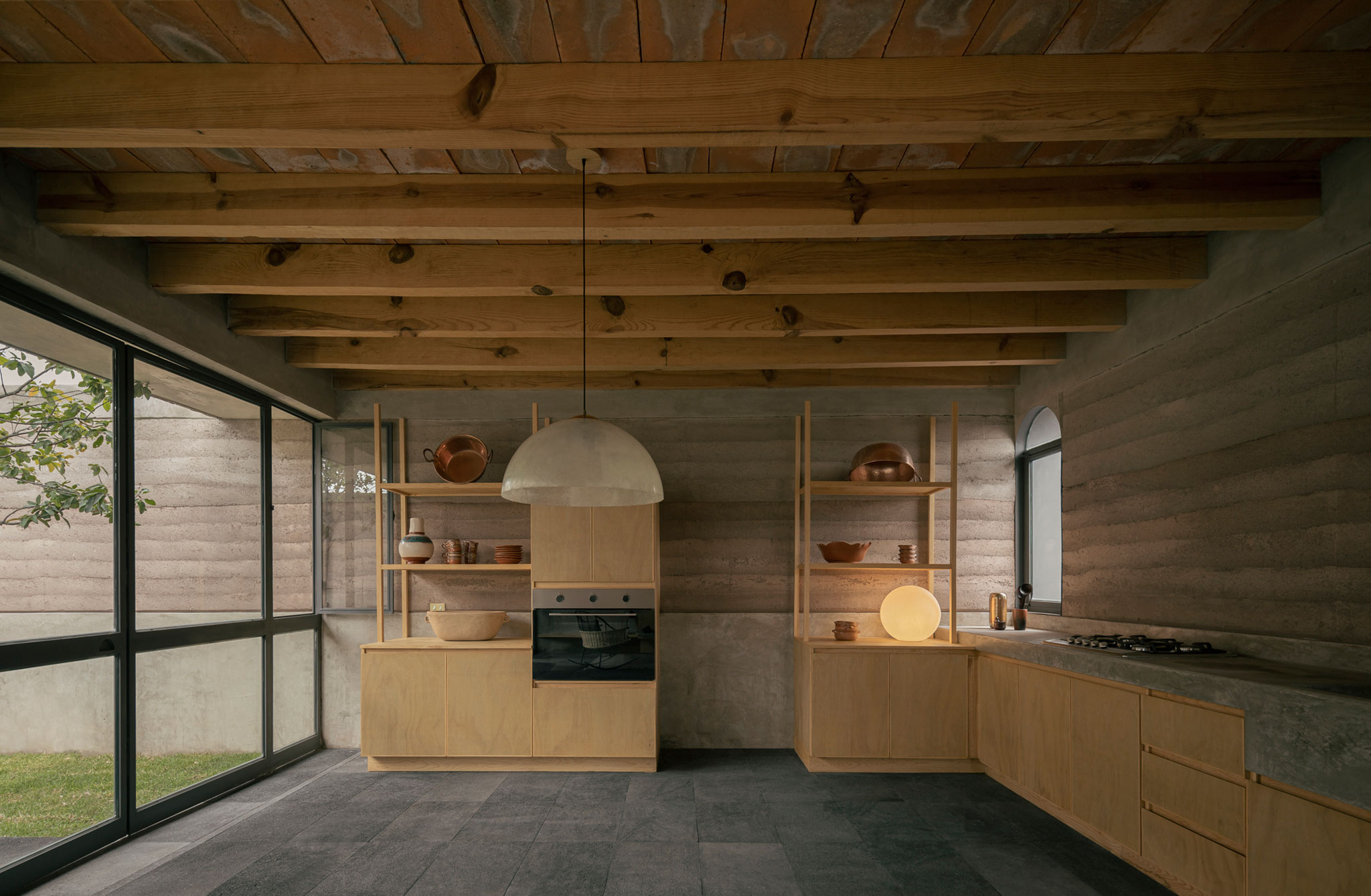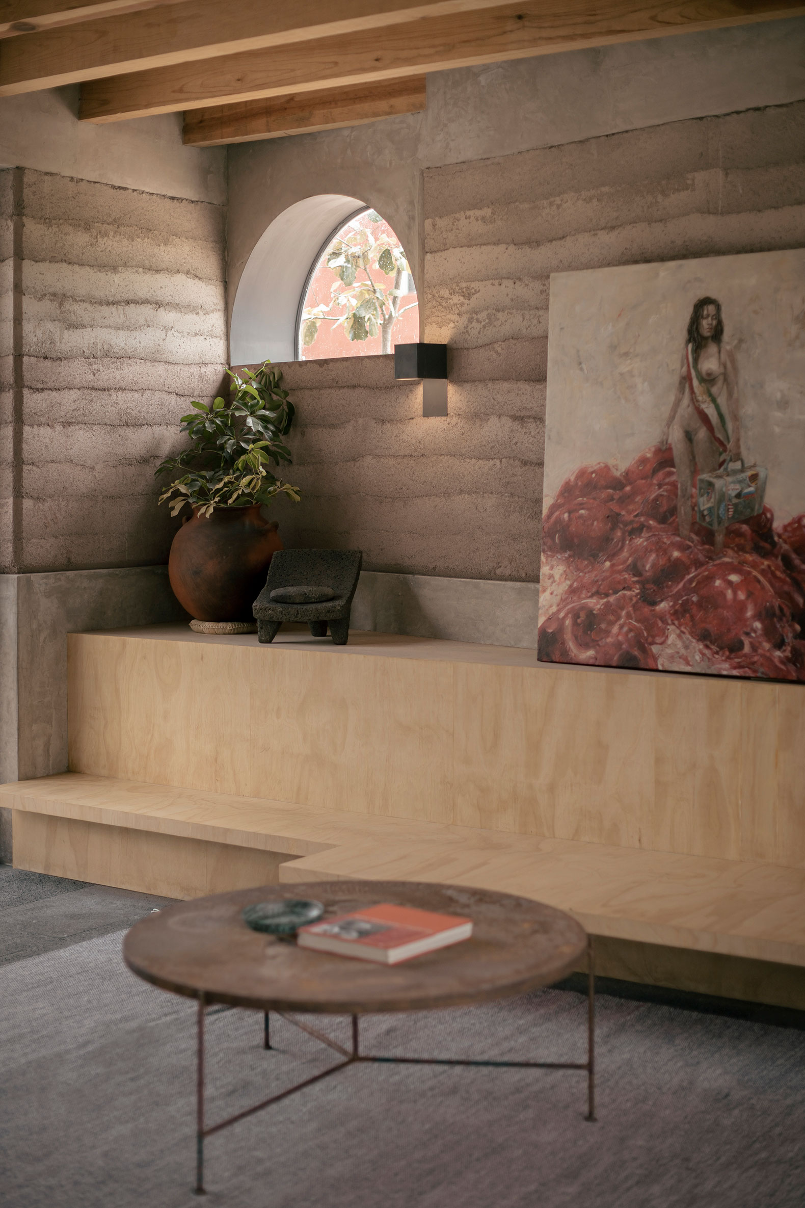 En los muros vemos un sistema antiguo de tierra apisonada, fusionada con técnicas contemporáneas de colado de concreto que nos habla de lo atemporal que es la arquitectura cuando se selecciona el diseño y la materialidad adecuada para el proyecto., se combinó el uso de muros de concreto y muros de tierra apisonada, de esta forma la función de estos muros no se queda tan solo como estructural, al incorporar estas técnicas de construcción permitimos generar atmosferas aislantes térmicas y acústicas, que además de ser funcionales, generan muy buen contraste con el piso de piedra negra recinto, la ventanería de herrería, y los acabados de muebles en carpintería y barras de cemento pulido, logrando una paleta monocromática pero con acentos sutiles que nos muestran gran honestidad en los materiales.