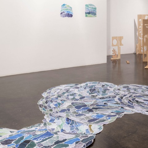 La escultura Island of Langerhans de Lina Puerta (New Jersey, 1969), emite un goteo pacífico. La pieza presenta agua corriente que se bombea a través de un entorno natural fantasioso y falso creado a partir de materiales encontrados, plantas artificiales y porcelanas hechas a mano dentro de una maleta vintage. Con ella, la artista traza un paralelismo con el páncreas humano en el que varias células parecen flores, destacando así su idea de la interconexión del cuerpo con la naturaleza. Para Puerta, el cuerpo es un paisaje acuático, de este modo, las formas anatómicas y botánicas híbridas de esta obra y de Cliff (también en la muestra), inciden en esta relación. La exposición también incluye la pieza Untitled (Turquoise), una superficie azul reluciente compuesta por un conjunto de telas, encajes, terciopelo, lentejuelas y alas de mariposa, que recuerda el papel esencial del agua en el ciclo de vida, responsable tanto de sustentar la vida como de su eventual podredumbre y regeneración. Como en una excavación arqueológica, las capas expuestas descubren secciones transversales de materiales y procesos incrustados dentro del trabajo.