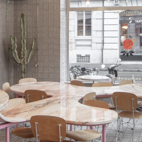 Más allá de las referencias obvias a los materiales tradicionales de la elaboración del pan, como el mármol y las rejillas de acero, la idea era bastante sencilla: una mesa de acogida que permitiera una gran variedad de configuraciones. De alguna manera, el decorado es medio doméstico, medio profesional, entre compartir «table d'hôtes» y cenar en el interior de una panadería.
