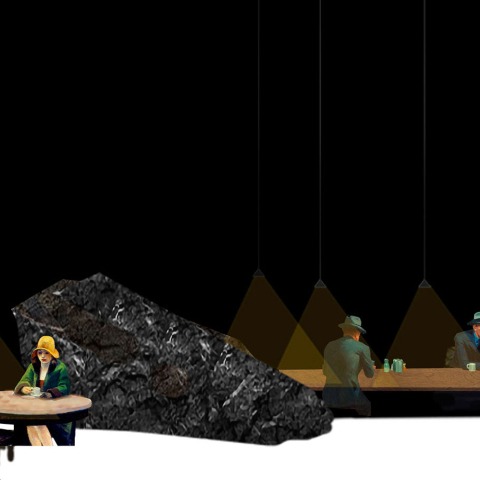 La incorporación de un material pétreo de alta tecnología cierra el discurso de la instalación. Habiendo planteado una escena que ahonda en el poder evocador de la piedra en su estado bruto y natural, encontramos la réplica en otro elemento, que acomoda los espacios más vivideros de la sala, y está en el reverso de esta idea.