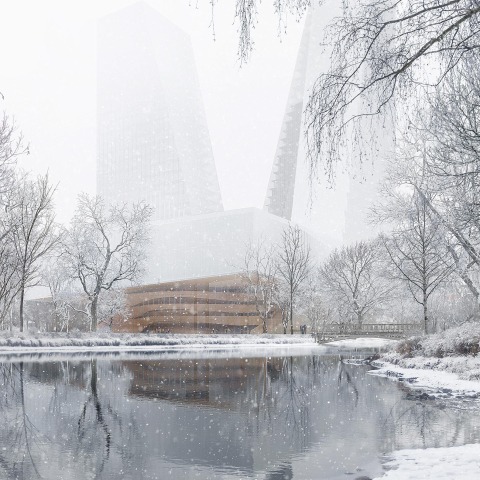 Desde los niveles horizontales, una inconfundible silueta en forma de V se eleva hacia el cielo. El conjunto de torres cambia su silueta desde cada nueva perspectiva, creando una expresión en constante cambio que recuerda a un dúo de baile. Las torres están diseñadas estratégicamente para reducir las sombras de las áreas circundantes del parque y el vecindario, al mismo tiempo que crean mejores condiciones de luz natural en el patio.