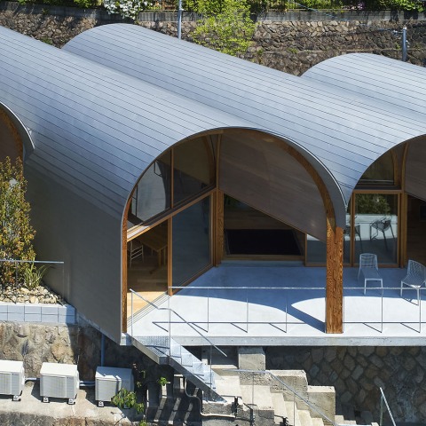 A continuación, se estudió la cubierta de la estructura y se decidió hacer una serie de techos abovedados a 45 grados en diagonal desde la retícula de arcos cruciformes. Al hacerlo, las coordenadas de las columnas cruciformes y la bóveda en diagonal se superponen en la parte superior e inferior, creando un flujo multiaxial que responde al flujo del camino en espiral circundante, y al mismo tiempo, la apertura de la casa puede extenderse en múltiples direcciones.