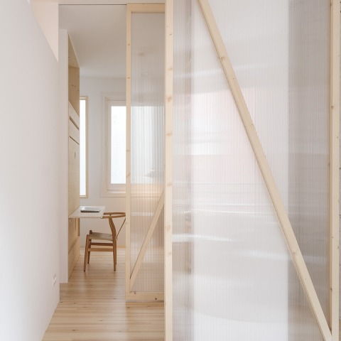 Por otro lado, la estrategia con el material consiste en minimizar la cantidad de elementos empleados, de modo que la materia contribuya a unificar la operación espacial y con ello a reducir los recursos empleados en la obra. Se define entonces un material principal, la madera de pino abeto, que se utiliza tanto en el pavimento como en el mobiliario; estableciendo así una expresión continua entre todos los elementos espaciales dispuestos. A su vez, se opta por la utilización de microcemento gris para las zonas húmedas de baño y cocina, evitando juntas y facilitando el futuro mantenimiento. El policarbonato empleado para los tabiques móviles busca definir un nuevo ámbito para entrever, conectar, dividir e iluminar la parte más profunda de la vivienda, estableciendo así una operación sutil y económica para estos elementos.