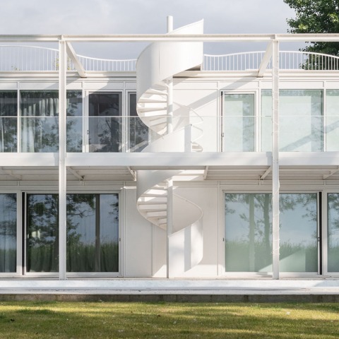 El edificio está enmarcado por una estructura delgada de acero. Ambos niveles se abren hacia el lago con terrazas, y el piso superior también cuenta con una terraza en el lado sur. Un sistema de pérgola con estores enrollables proporciona sombra confortable. Barandillas de vidrio encierran las terrazas. Una escalera de caracol de acero conduce a la azotea plana, donde se ubican una terraza compartida y un jacuzzi. La gran terraza de la planta baja está conectada a una cocina de verano y a una piscina hundida a nivel del suelo. Un largo muelle atraviesa los juncos hasta el agua abierta.