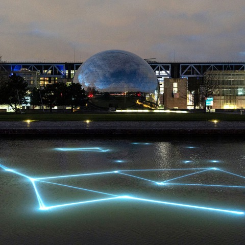 Entre una obra de luz y el arte digital, Constellation compone un ballet galáctico, que brilla sobre la superficie del agua del canal de Ourq. Con una banda sonora envolvente, las proyecciones láser animan una arquitectura de luces en movimiento, cuyos rayos se cruzan e interconectan. Diseñado específicamente para el lugar, el proyecto se integra perfectamente en esta parte del parque situada frente a la Cité des sciences et de l'industrie de Paris. Simplemente fijados a los mástiles estructurales de la larga pasarela que bordea el canal, los proyectores láser componen un dispositivo minimalista que se integra en el paisaje. A pesar de su gran tamaño, requiere muy poca electricidad (menos de 1600 vatios).