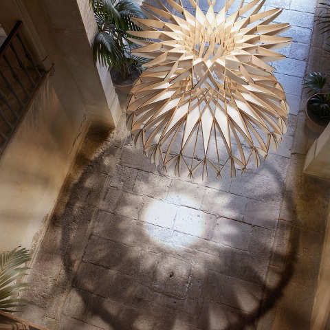La integración del diseño, el arte y la luz en la arquitectura data de hace mucho tiempo, y tal vez esta es la razón por la cual las lámparas gradualmente han dejado de ser sólo un elemento emisor de luz para convertirse en una escultura de luz que confiere una personalidad especial para el producto y su ambiente. Es tal la importancia de la luz que cualquier cambio en el elemento puede alterar el concepto formal de todo el proyecto. Una escultura puede parecer más o menos estática, en función de la luz recibida. Con DOME decidimos sacar la luz del objeto para convertirlo en una escultura de luz diseñada para recibir y emitir una luz delicada, un juego de sombras y matices que enriquecen el espacio para el que fueron creados. El desarrollo de este proyecto con Benedetta nos ha permitido reflexionar sobre el arte de la iluminación, sobre la manera de reinterpretar la luz y en la creación de productos con un enfoque más artístico y una mirada menos industrial. También nos ha permitido ser arrastrados y hacer lo que realmente nos gusta hacer. Estas esculturas de luz son completamente hechas a mano y son producidos enteramente en el Barcelona, por HQ Bover. Más de 170 fragmentos grandes y pequeños de madera se entrelazan con prudencia y se cosen uno a uno para terminar encajando como un rompecabezas.