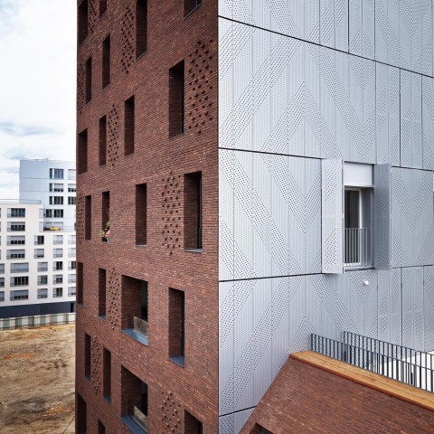 Las unidades también consideran la ambigüedad entre el gigantismo de la ciudad y la intimidad de su calle abriendose al centro de la parcela a través de balcones y galerías, que se esconden detrás de la chapa perforada, o por medio de galerías cortadas con ladrillo a la calle. Cada apartamento dispone de, al menos, una doble exposición: multiplicando la exposición de cada unidad de proyecto, se transforman los aportes de luz natural con el fin de conectar el interior con su entorno. Esto también multiplica los puntos de vista en una ciudad en constante cambio que se apoya en sí misma y extiende sus fronteras para regenerar su identidad.