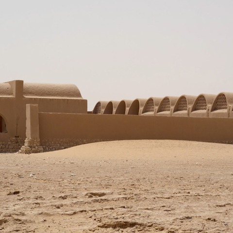 During the 1960s underground water reserves were found at the Kharga Oasis, three hours’ drive through the inhospitable desert from Luxor. Here, Fathy was commissioned to build New Baris, another adobe town that was to be a sustainable community growing and exporting fruit and vegetables from the desert. To help with the storage of perishables in the new settlement, Fathy added incrementally reduced airshafts and secondary towers to accelerate air circulation reducing outside temperatures by over fifteen degrees. New Baris remains unfinished, as construction was stopped during to the war in 1967. At New Gourna, restoration has been suspended since the 2011 revolution. The town is slowly disappearing into the decaying concrete outskirts of Luxor, where buildings are at least ten degrees hotter in summer and colder in winter.