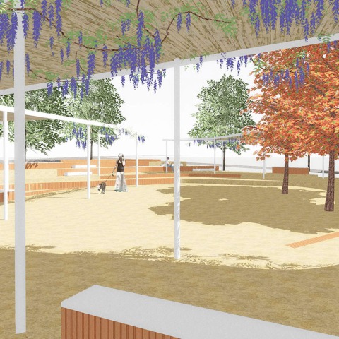 La plaza trabaja también con la componente temporal que aporta riqueza y variabilidad a través de la selección de especies. Se proyectan unos árboles caducifolios de crecimiento rápido y una pérgola metálica de trazado sinuoso que acompañan al peatón en sus posibles recorridos, proporcionando un lugar de refugio. El entramado de mimbre de la pérgola funciona como filtro de luz que proporciona sombra desde el primer momento. A medio y largo plazo quedará invadido por unas enredaderas que en primavera y en invierno tienen una floración azul y lila espectaculares. La estructura metálica propicia además usos flexibles ya sean expositivos, de celebraciones, fiestas, lúdicos, etc.