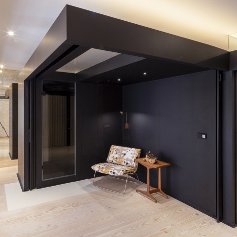 Un elemento central, con ambición escultórica exenta, en forma de cubo y materia metálica, sirve de “piedra angular” sobre la cual se organiza la vivienda. En menos de 6m² de uso permanente y 11m² de huella, se agrupan usos colindantes que pueden diferenciarse en distintos dormitorios, zonas de paso, rincones de lectura, recibidores, varios cuartos de baño, espacios de almacenaje, cocina, comedor, cuarto de estar… Su tonalidad oscura busca diferenciarse del resto de la vivienda, el clarísimo abeto danés del suelo, el pino Flandes de los armarios, el pino Melis de las ventanas, los tonos neutros de paredes y techo de toda la vivienda, y de las “alfombras” de microcemento en las áreas húmedas.