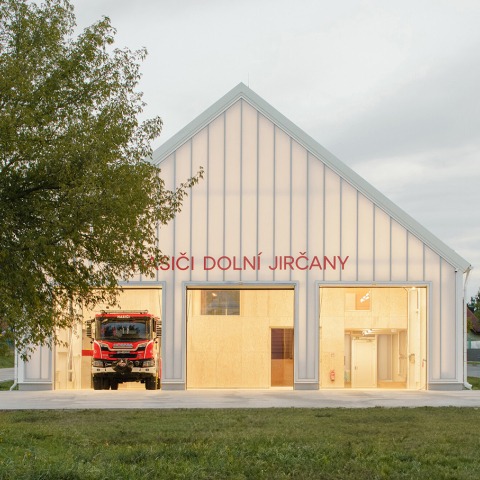 El parque de bomberos está diseñado de tal manera que su forma y volumen se asemejan a la tipología de los graneros rurales. Su forma rectangular y su tejado a dos aguas también crean una conexión visual con la escuela primaria al otro lado de la calle. Está ubicado en un terreno municipal en la zona de desarrollo noroeste de Dolní Jirčany. Su ubicación en las afueras del pueblo, con acceso inmediato a la infraestructura de transporte, proporciona a los bomberos una ubicación conveniente para intervenciones rápidas y efectivas.