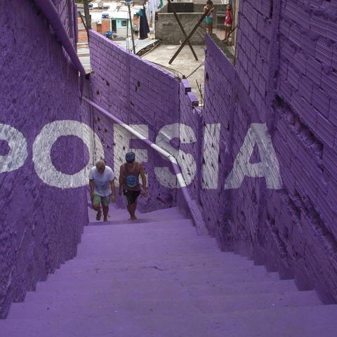 Hemos pintado dos nuevas palabras, para extender el radio de acción de la red inicial. “Poesía” y “Magica”, violeta y verde, subrayan la belleza de la informalidad, el encanto del crecimiento urbano espontáneo, la intensidad de las relaciones entre los moradores, la sonrisa de los niños que juegan escaleras arriba y abajo.